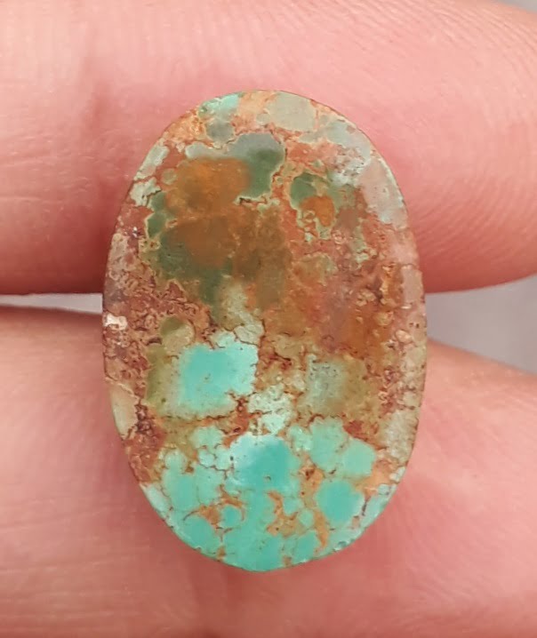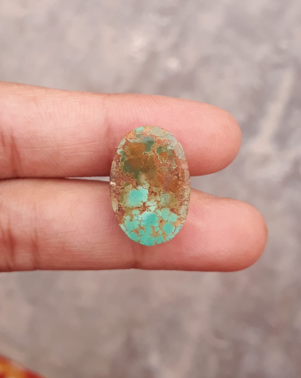 تم قطع كابوشون Green Matrix Turquoise الأصلي بدقة إلى شكل بيضاوي ويبلغ قياسه 19x13 ملم. هذا الحجر الكريم الفريد مصنوع من البيريت الفيروزي عالي الجودة، وهو أمر لا بد منه لأي مجموعة.