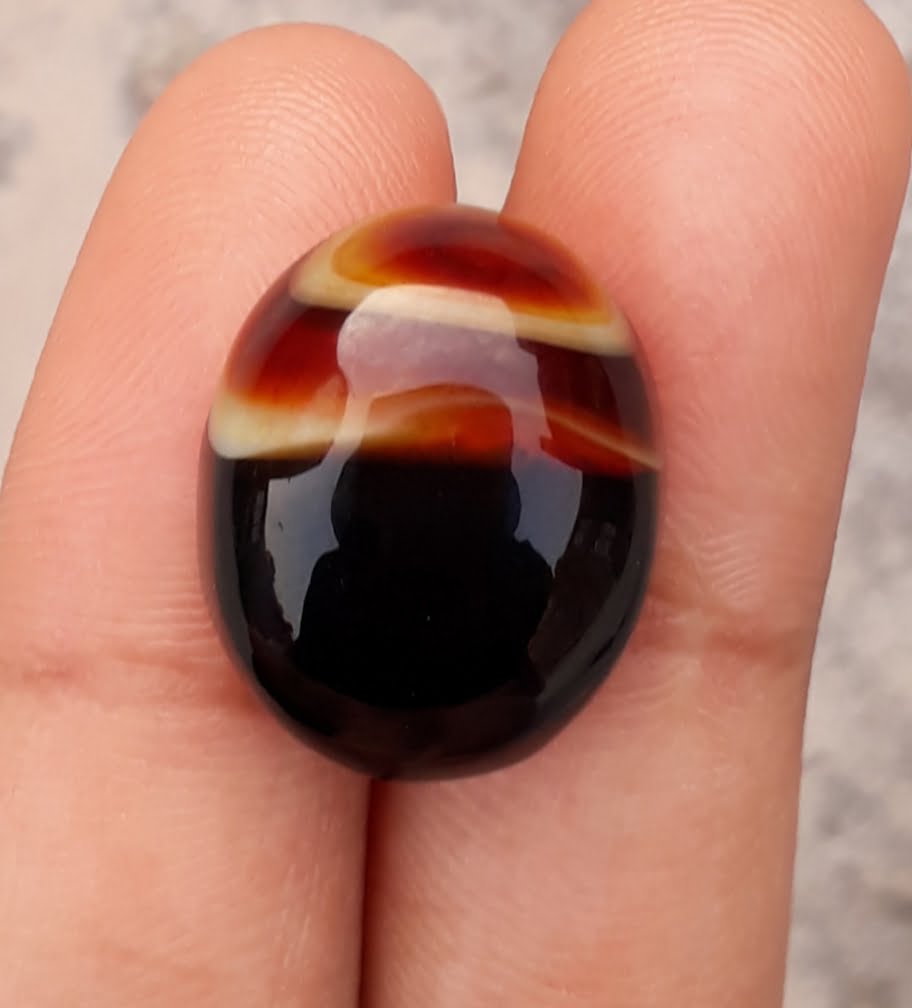 هذا العقيق هو مثال مذهل للعقيق ذو الطبقات المتعددة. تتميز بقاعدة سوداء عميقة مع طبقات كريمية وحمراء، وهي قطعة آسرة ذات مظهر فريد. ستضفي أنماطها المخططة عنصرًا ملفتًا للنظر على أسلوبك.