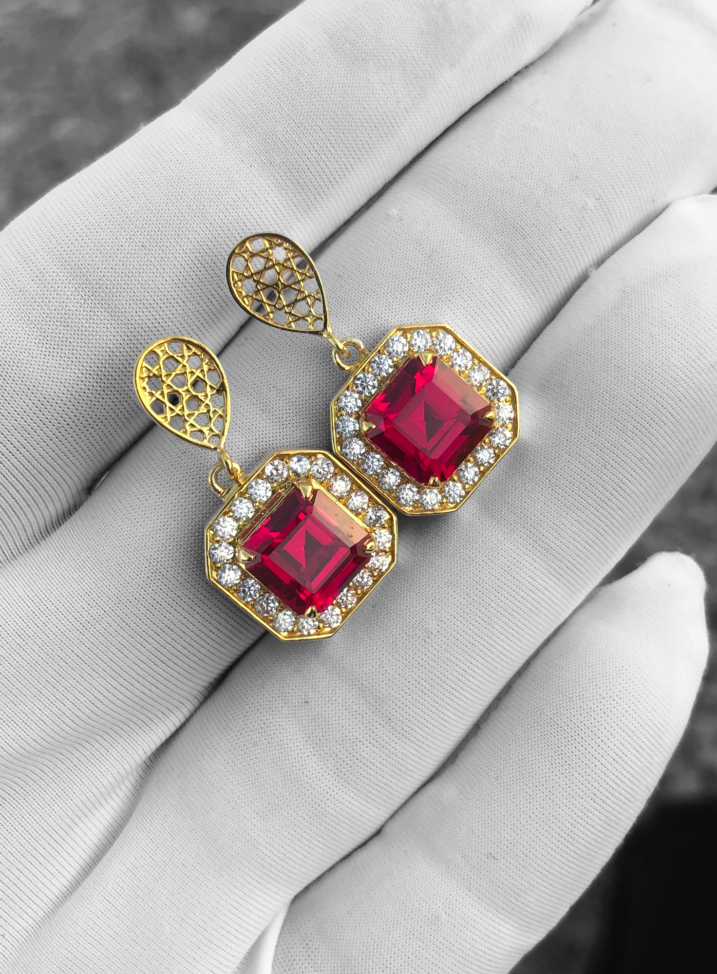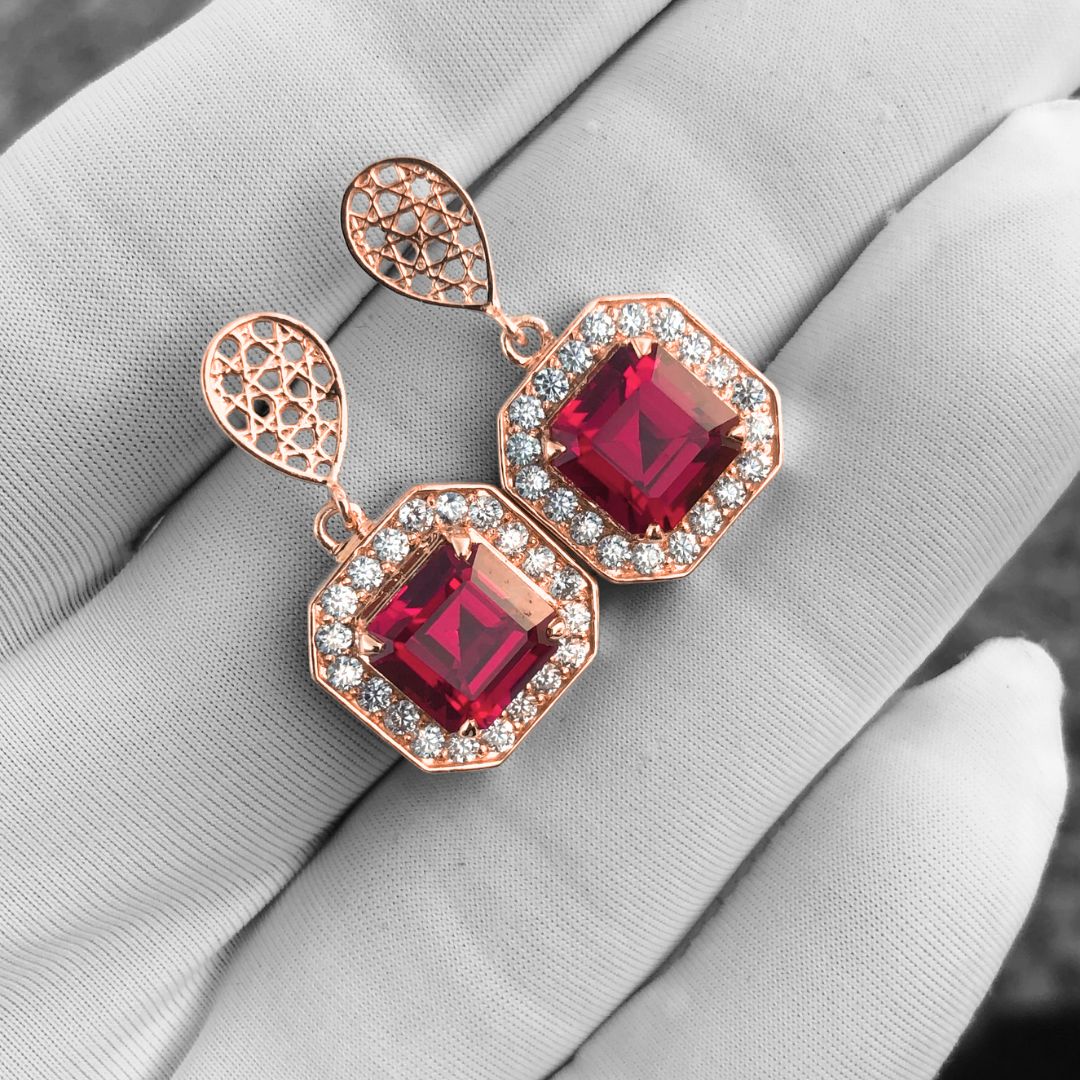 من روح التصميم المقدس، تأتي أقراط جان عالم، حيث يجتمع التاريخ والتفاني والجمال. مستوحاة من الهندسة الإلهية للفن الإسلامي، هذه الأقراط مزينة بألماس متألق وياقوتة عميقة متقدة، تعكس قرونًا من الثراء الثقافي والرمزية الروحية. إنها تحفة فنية في غاية الأناقة، أكثر من مجرد مجوهرات، إنها انعكاس للتراث يُلبس بأناقة.