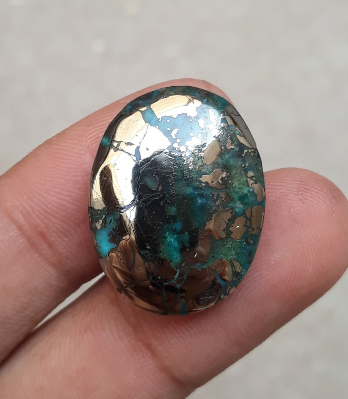 يتميز هذا الكابوشون الفيروزي الفارسي الكلاسيكي بلون أخضر عميق مذهل ومصفوفة البيريت المعقدة. تم قطع هذا الحجر بوزن 35.6 قيراط بشكل احترافي، وهو خيار مثالي لصنع مجوهرات جميلة أو استخدامه كمقتنيات. بفضل تصميمها اللافت للنظر، من المؤكد أنها ستضيف الجمال إلى أي قطعة.