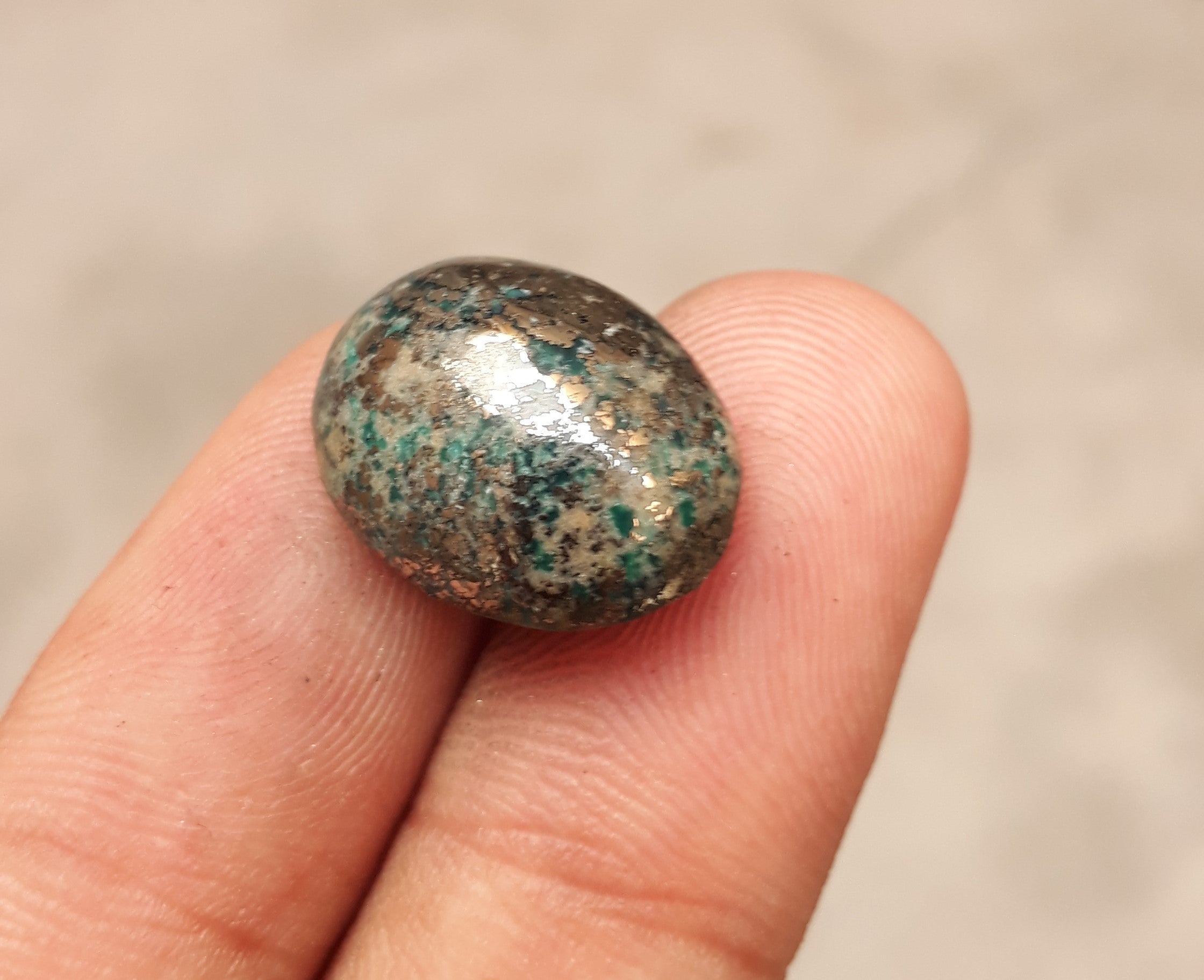 يتميز هذا الكابوشون الفيروزي الفارسي الكلاسيكي بلون أزرق داكن مذهل ومصفوفة البيريت المعقدة. تم قطع هذا الحجر بوزن 52.7 قيراط بشكل احترافي، وهو خيار مثالي لصنع مجوهرات جميلة أو استخدامه كمقتنيات. بفضل تصميمها اللافت للنظر، من المؤكد أنها ستضيف الجمال إلى أي قطعة.