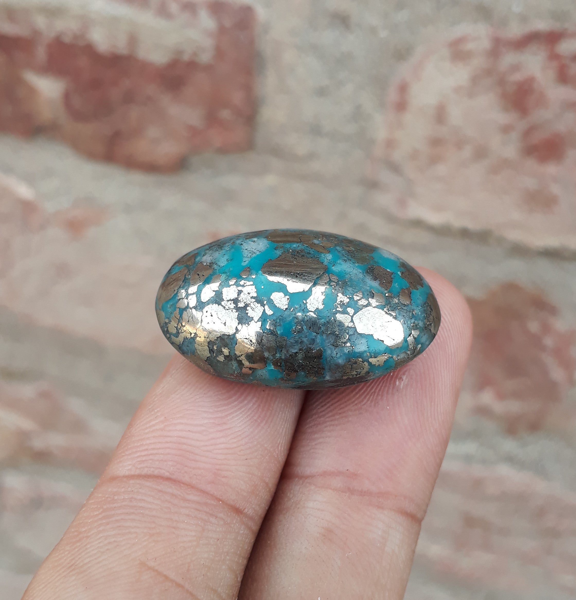 يتميز هذا الكابوشون الفيروزي الفارسي الكلاسيكي بلون أزرق داكن مذهل ومصفوفة البيريت المعقدة. تم قطع هذا الحجر بوزن 52.7 قيراط بشكل احترافي، وهو خيار مثالي لصنع مجوهرات جميلة أو استخدامه كمقتنيات. بفضل تصميمها اللافت للنظر، من المؤكد أنها ستضيف الجمال إلى أي قطعة.