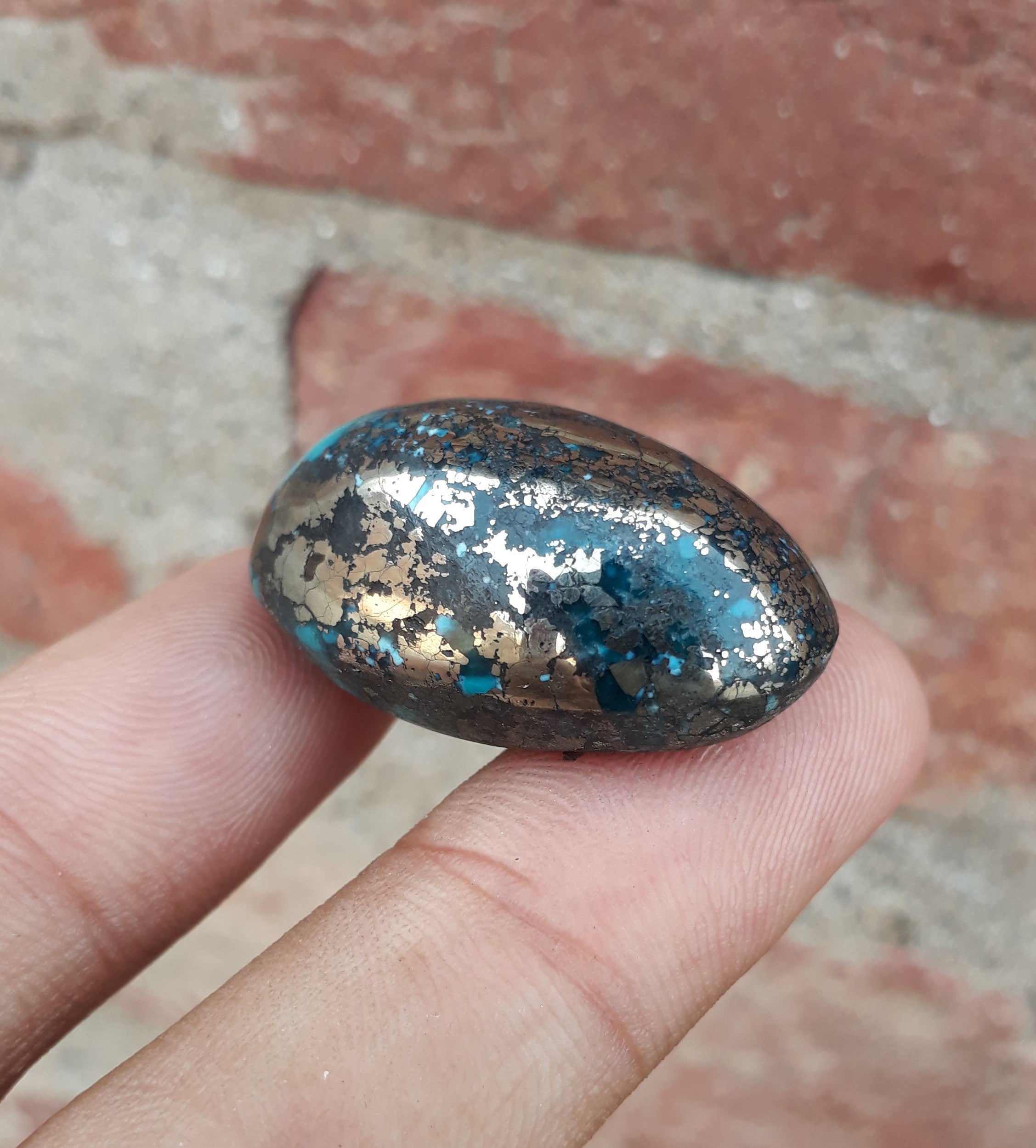 يتميز هذا الكابوشون الفيروزي الفارسي الكلاسيكي بلون أزرق داكن مذهل ومصفوفة البيريت المعقدة. تم قطع هذا الحجر بوزن 52.7 قيراط بشكل احترافي، وهو خيار مثالي لصنع مجوهرات جميلة أو استخدامه كمقتنيات. بفضل تصميمها اللافت للنظر، من المؤكد أنها ستضيف الجمال إلى أي قطعة.