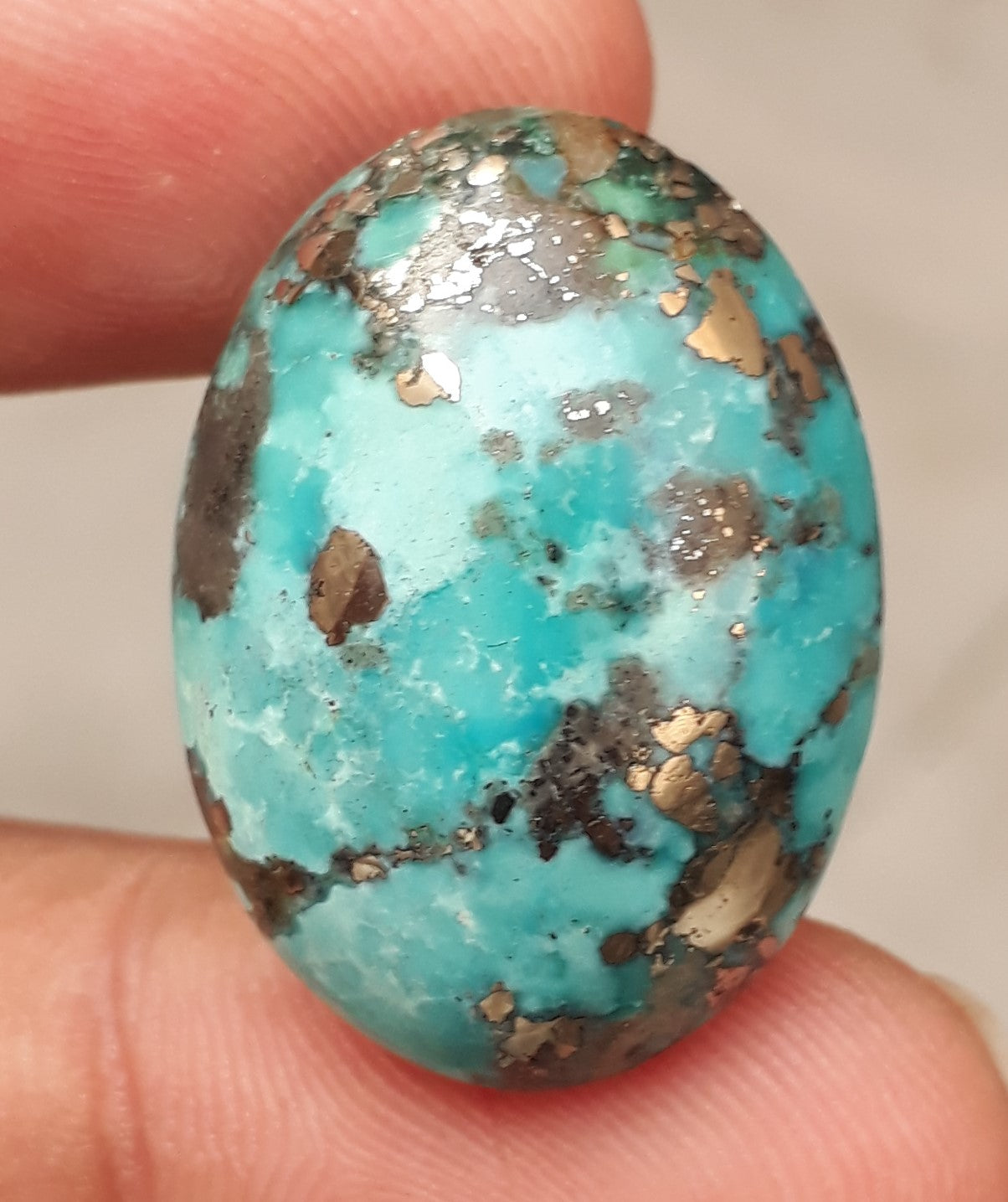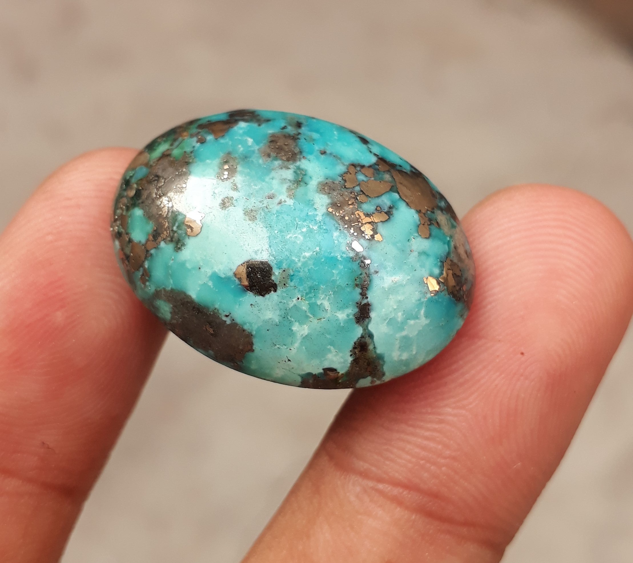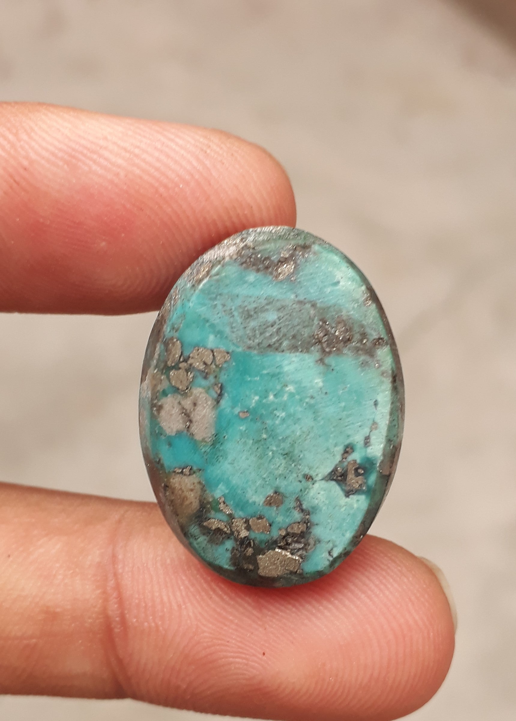 يتميز هذا الكابوشون الفيروزي الفارسي الكلاسيكي بلون أزرق داكن مذهل ومصفوفة البيريت المعقدة. تم قطع هذا الحجر بوزن 52.7 قيراط بشكل احترافي، وهو خيار مثالي لصنع مجوهرات جميلة أو استخدامه كمقتنيات. بفضل تصميمها اللافت للنظر، من المؤكد أنها ستضيف الجمال إلى أي قطعة.