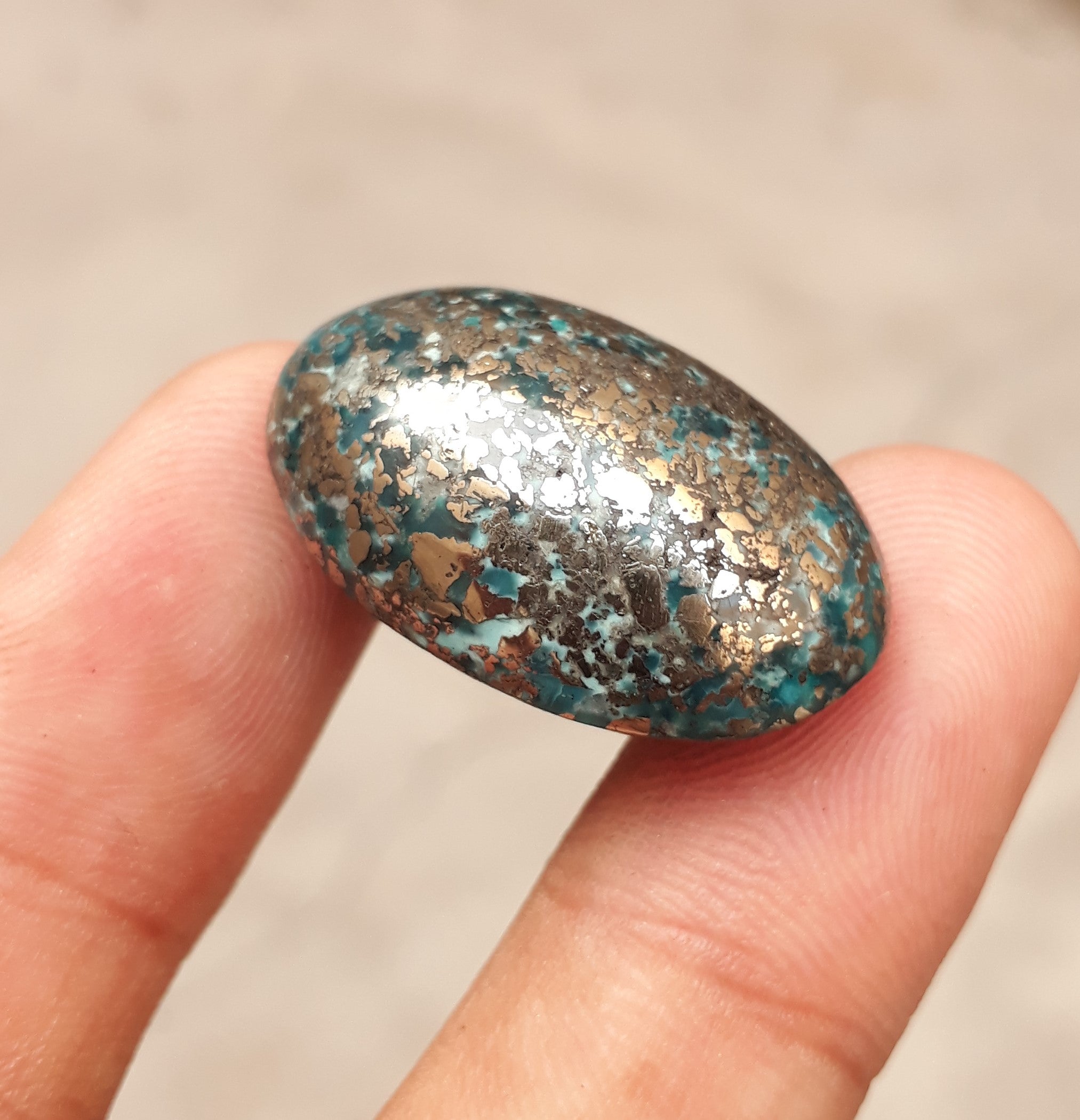 يتميز هذا الكابوشون الفيروزي الفارسي الكلاسيكي بلون أزرق داكن مذهل ومصفوفة البيريت المعقدة. تم قطع هذا الحجر بوزن 52.7 قيراط بشكل احترافي، وهو خيار مثالي لصنع مجوهرات جميلة أو استخدامه كمقتنيات. بفضل تصميمها اللافت للنظر، من المؤكد أنها ستضيف الجمال إلى أي قطعة.