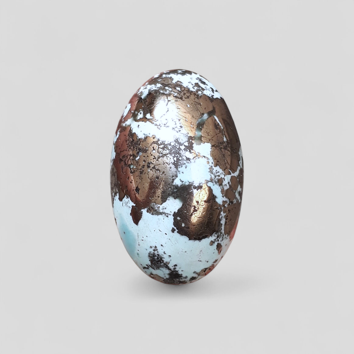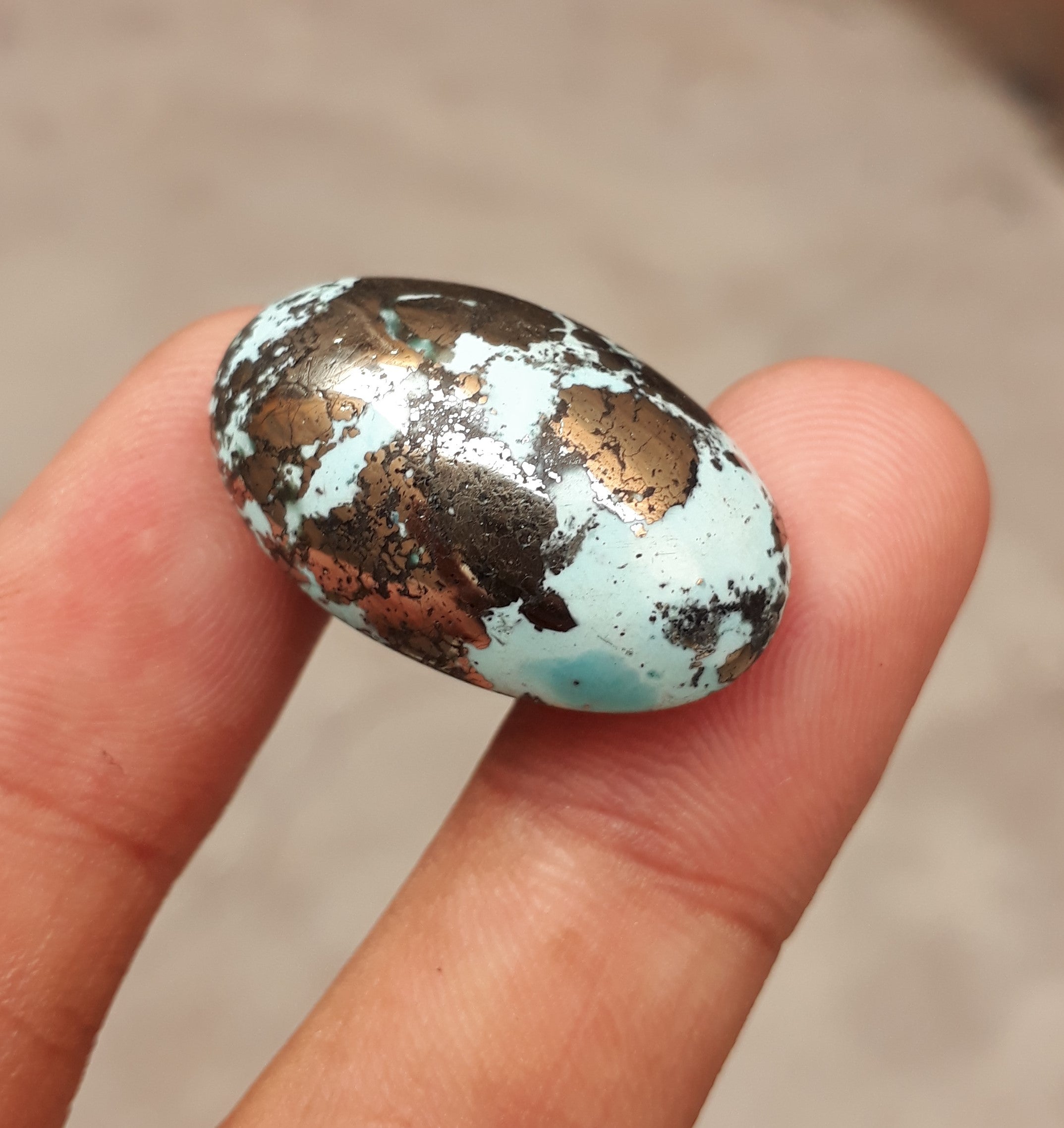 يتميز هذا الكابوشون الفيروزي الفارسي الكلاسيكي بلون أزرق داكن مذهل ومصفوفة البيريت المعقدة. تم قطع هذا الحجر بوزن 52.7 قيراط بشكل احترافي، وهو خيار مثالي لصنع مجوهرات جميلة أو استخدامه كمقتنيات. بفضل تصميمها اللافت للنظر، من المؤكد أنها ستضيف الجمال إلى أي قطعة.