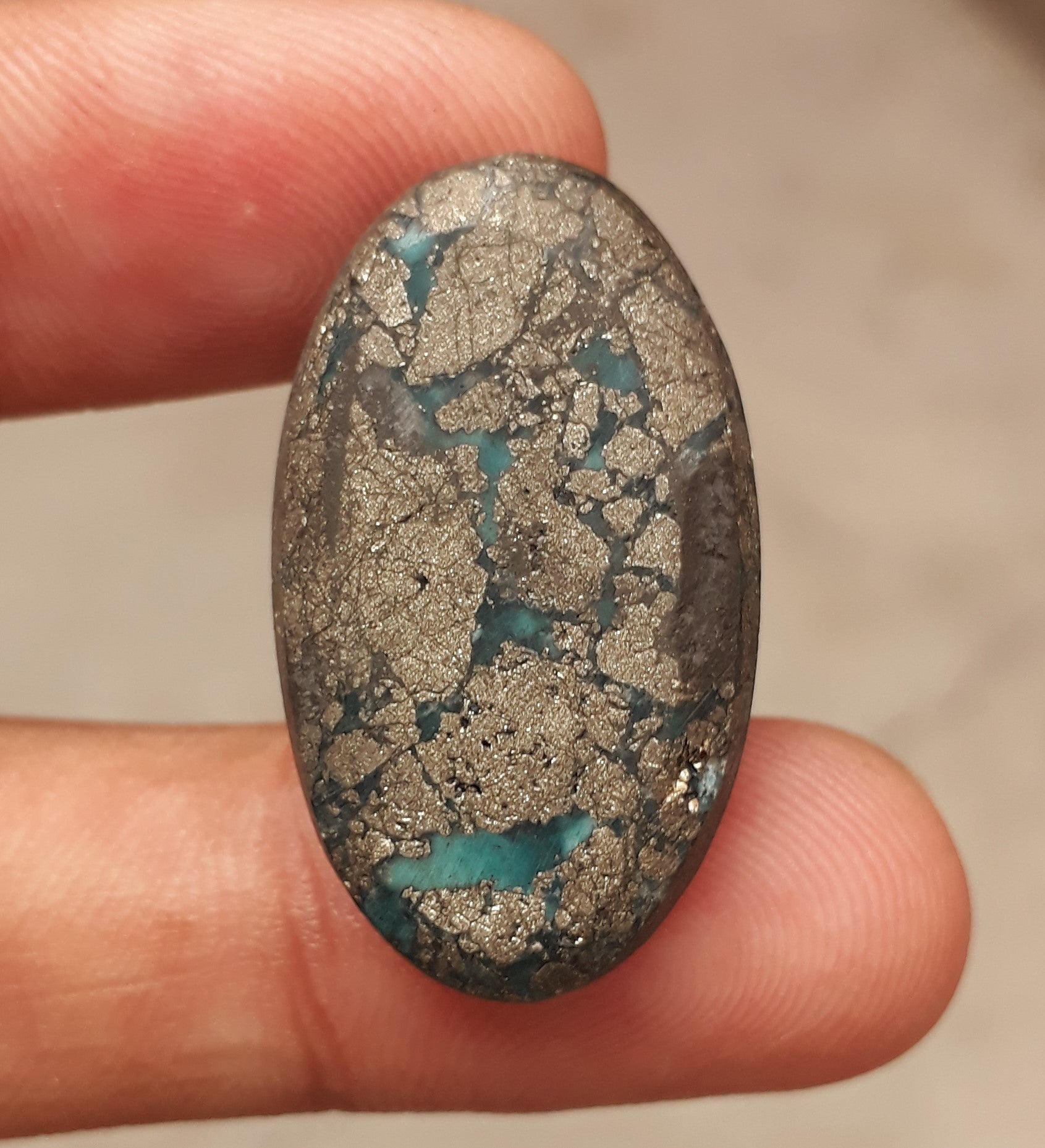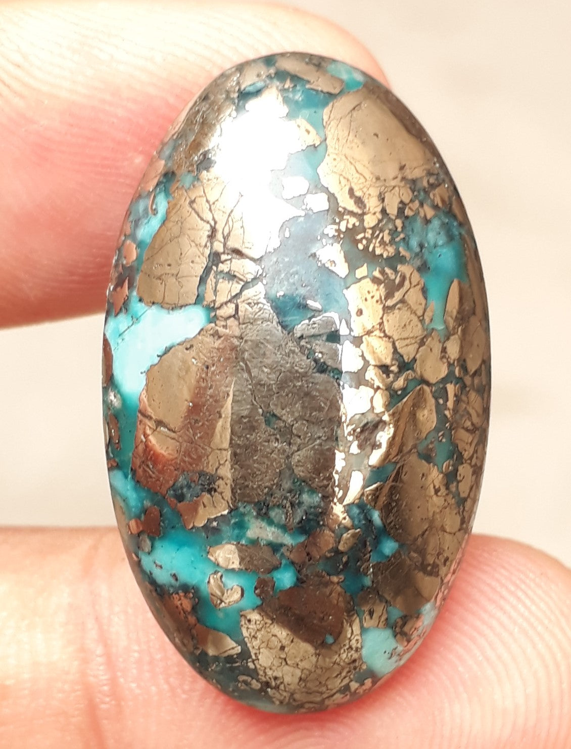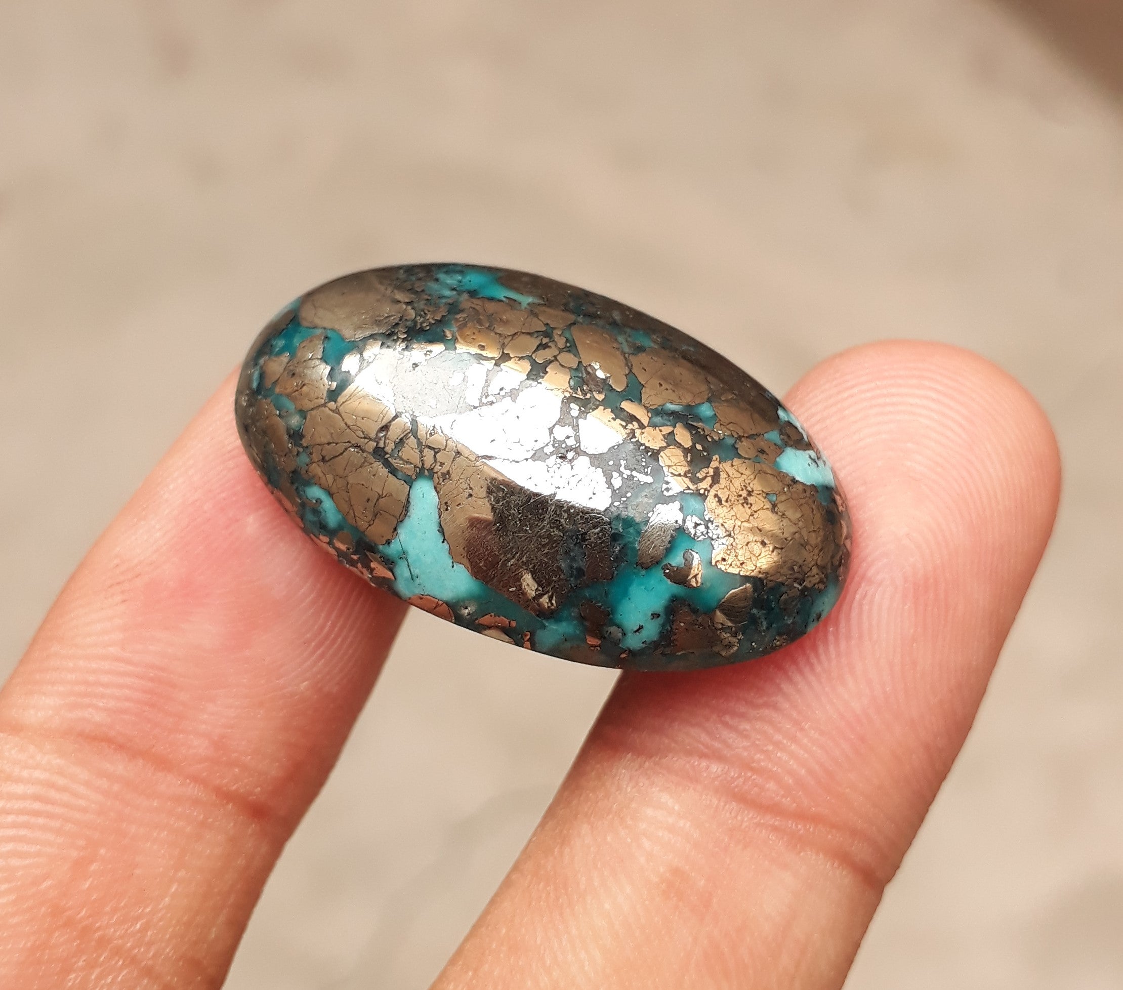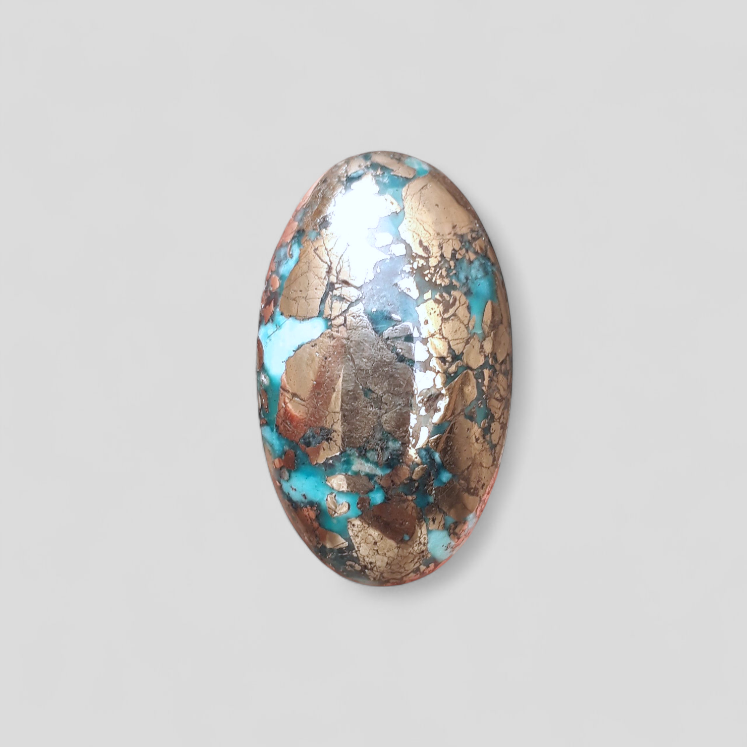 يتميز هذا الكابوشون الفيروزي الفارسي الكلاسيكي بلون أزرق داكن مذهل ومصفوفة البيريت المعقدة. تم قطع هذا الحجر بوزن 52.7 قيراط بشكل احترافي، وهو خيار مثالي لصنع مجوهرات جميلة أو استخدامه كمقتنيات. بفضل تصميمها اللافت للنظر، من المؤكد أنها ستضيف الجمال إلى أي قطعة.