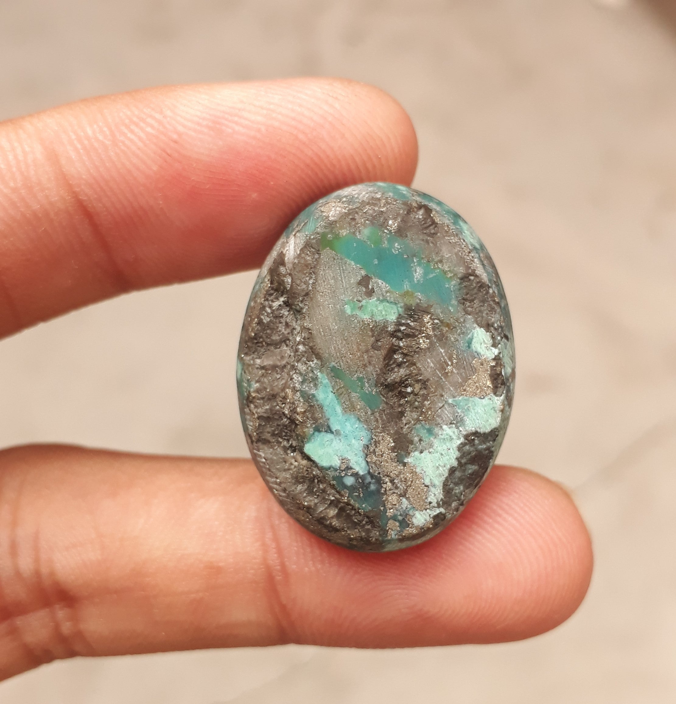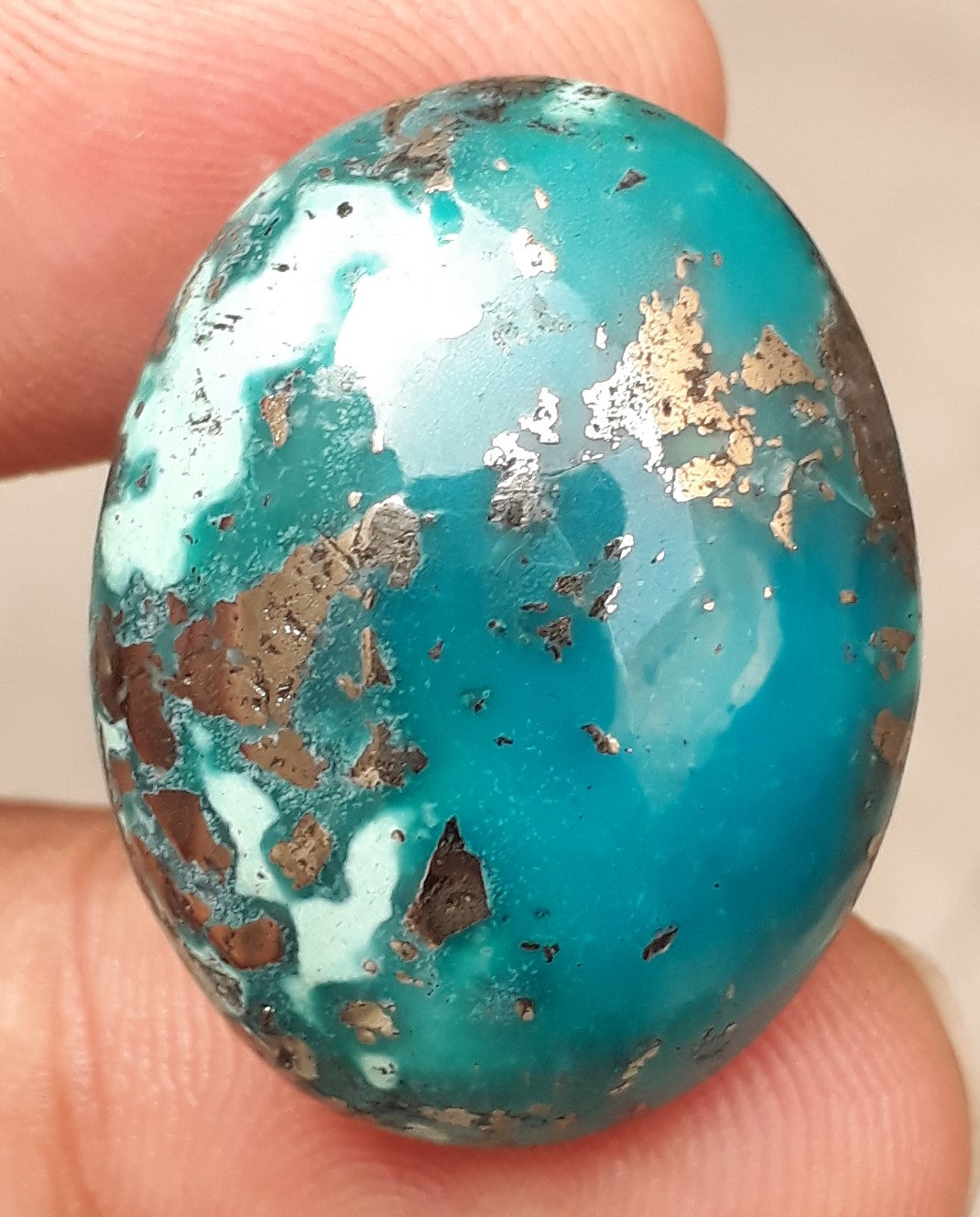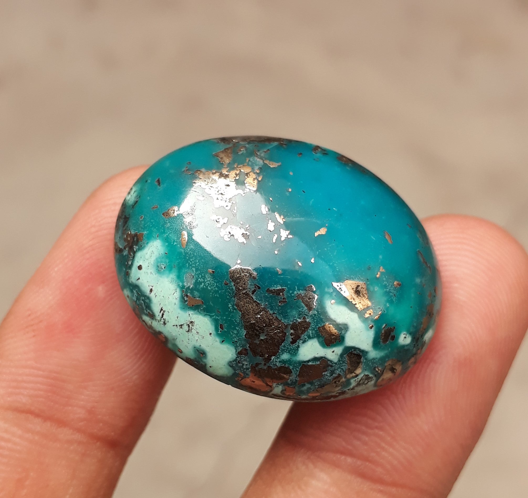 يتميز هذا الكابوشون الفيروزي الفارسي الكلاسيكي بلون أزرق داكن مذهل ومصفوفة البيريت المعقدة. تم قطع هذا الحجر بوزن 52.7 قيراط بشكل احترافي، وهو خيار مثالي لصنع مجوهرات جميلة أو استخدامه كمقتنيات. بفضل تصميمها اللافت للنظر، من المؤكد أنها ستضيف الجمال إلى أي قطعة.