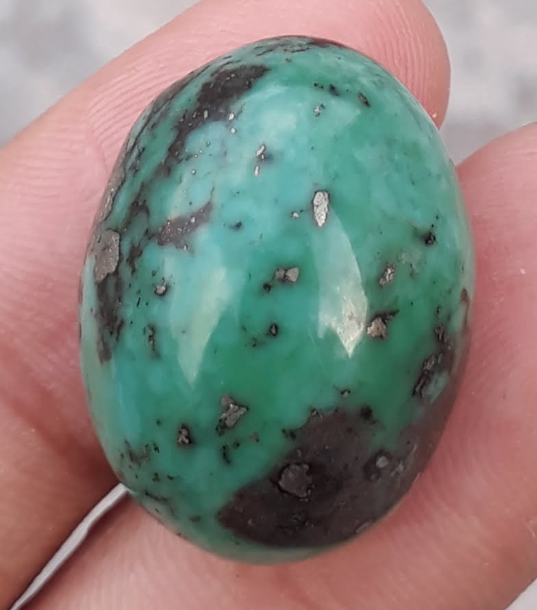 This beautiful Natural Turquoise, Green Matrix Turquoise, Oval Shape, Real Firoza Stone (Shajri Feroza) adds an elegant sparkle to any jewelry. The natural gemstone is sourced from Pakistan and is 25mm x20mm in dimensions. It showcases a unique combination of the Real Firoza Stone and Pyrite Turquoise, which gives it a unique, sophisticated look. Perfect for any occasion, this Green Turquoise is an original Hussaini Feroza and an impressive statement piece.