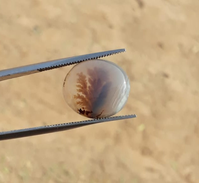 This Natural Dendritic Agate gemstone is a 16x14mm, natural cut, finely polished stone; an earthy and elegant addition to any jewelry collection. Its distinct pattern of clear grey and white tones adds character and depth to the unique stone.