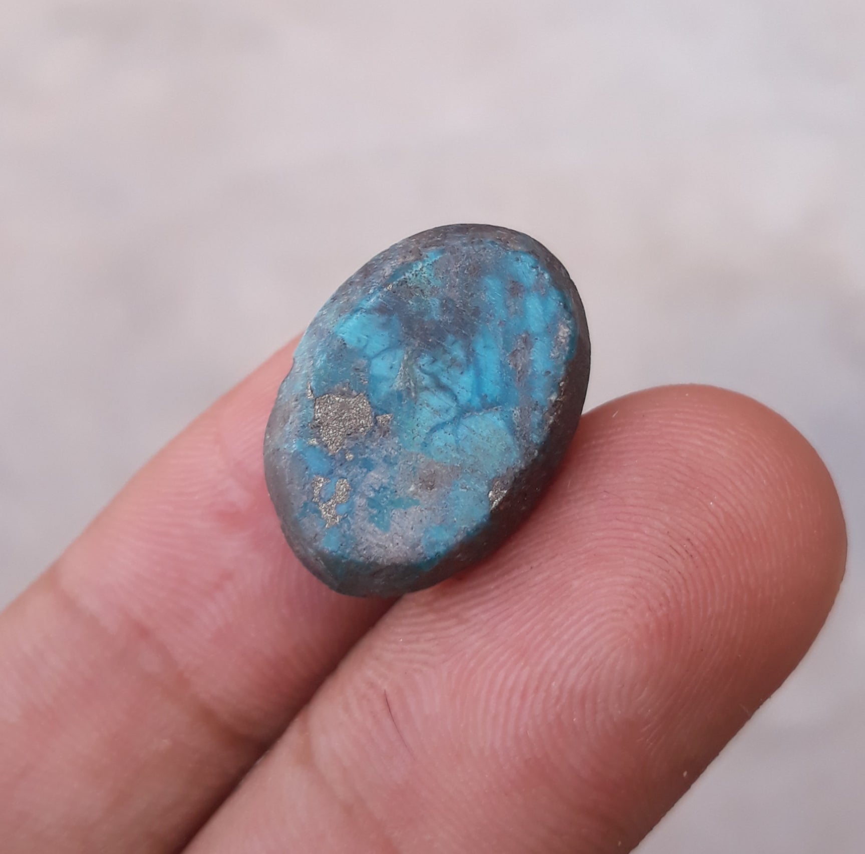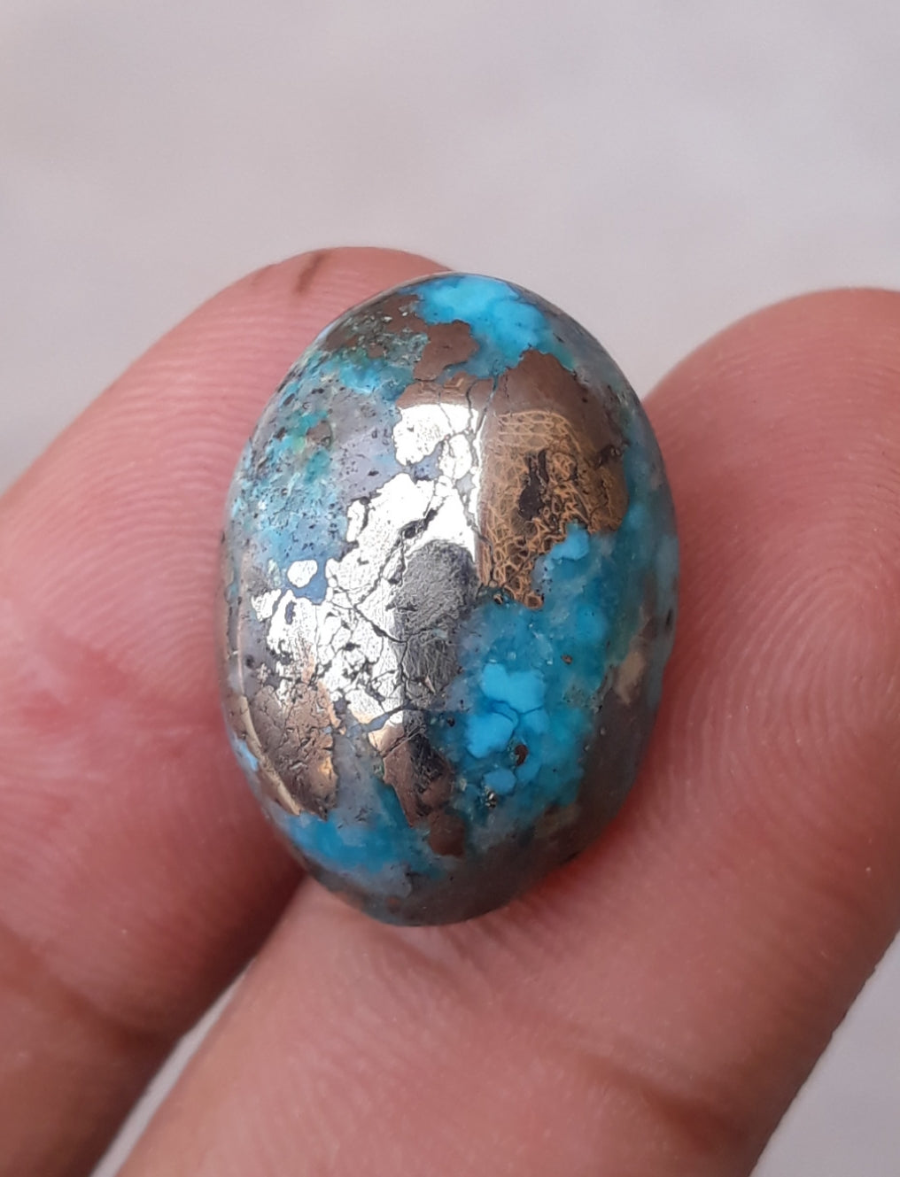 This classic Persian Turquoise cabochon features a stunning deep blue color and intricate Pyrite matrix. Professionally-cut to shape, this 23-carat stone is a perfect choice for creating beautiful jewelry or using as a collectible. With its eye-catching design, it is sure to add beauty to any piece.