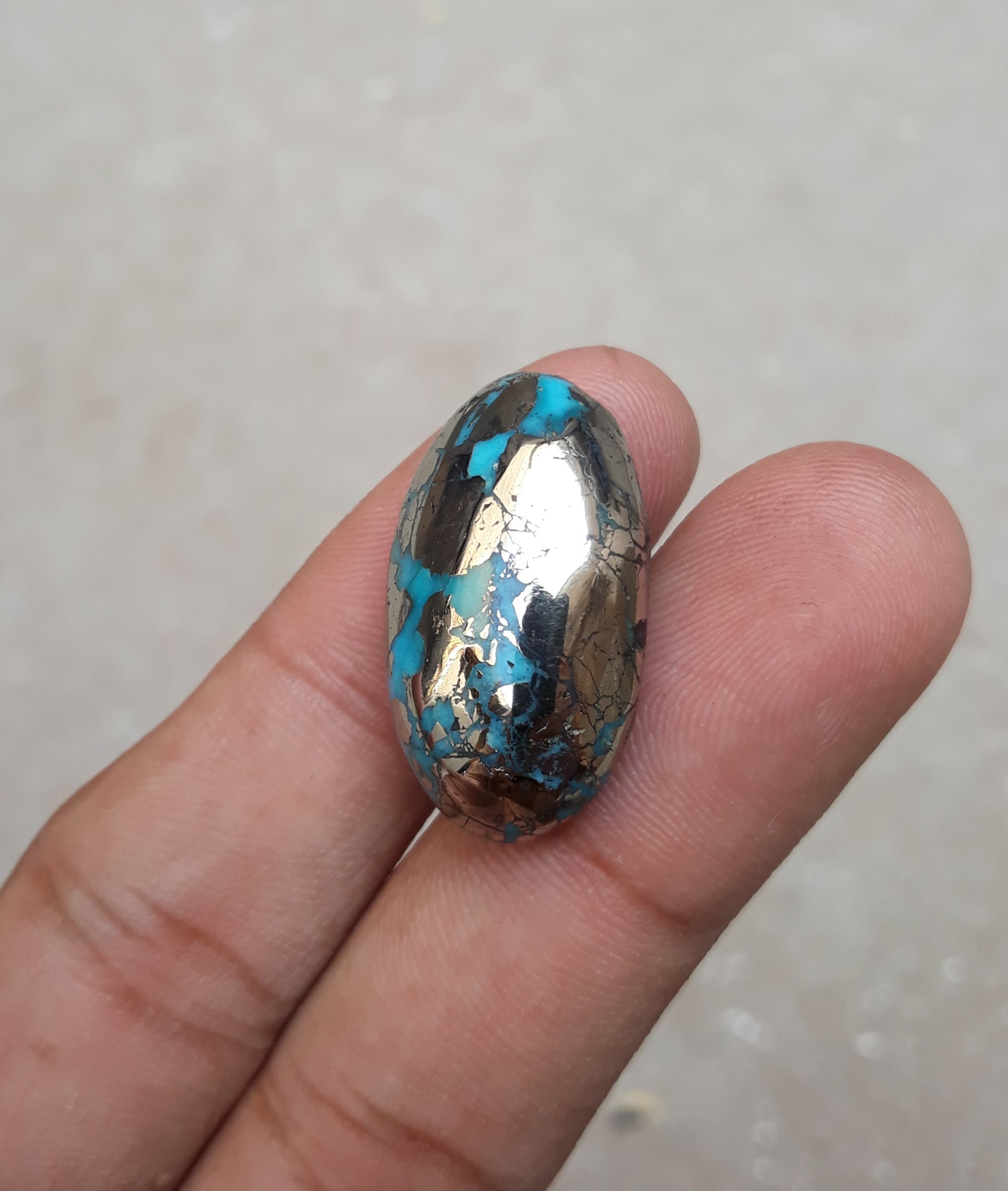 This classic Persian Turquoise cabochon features a stunning deep blue color and intricate Pyrite matrix. Professionally-cut to shape, this 48.4-carat stone is a perfect choice for creating beautiful jewelry or using as a collectible. With its eye-catching design, it is sure to add beauty to any piece.