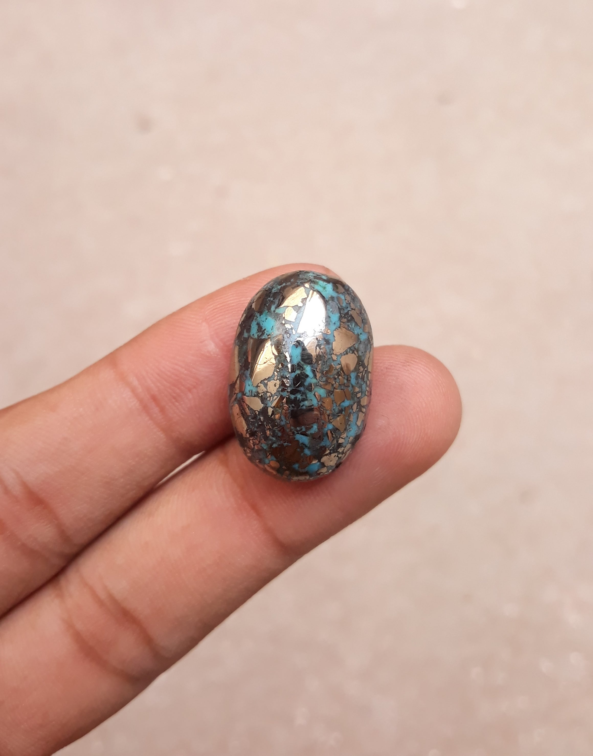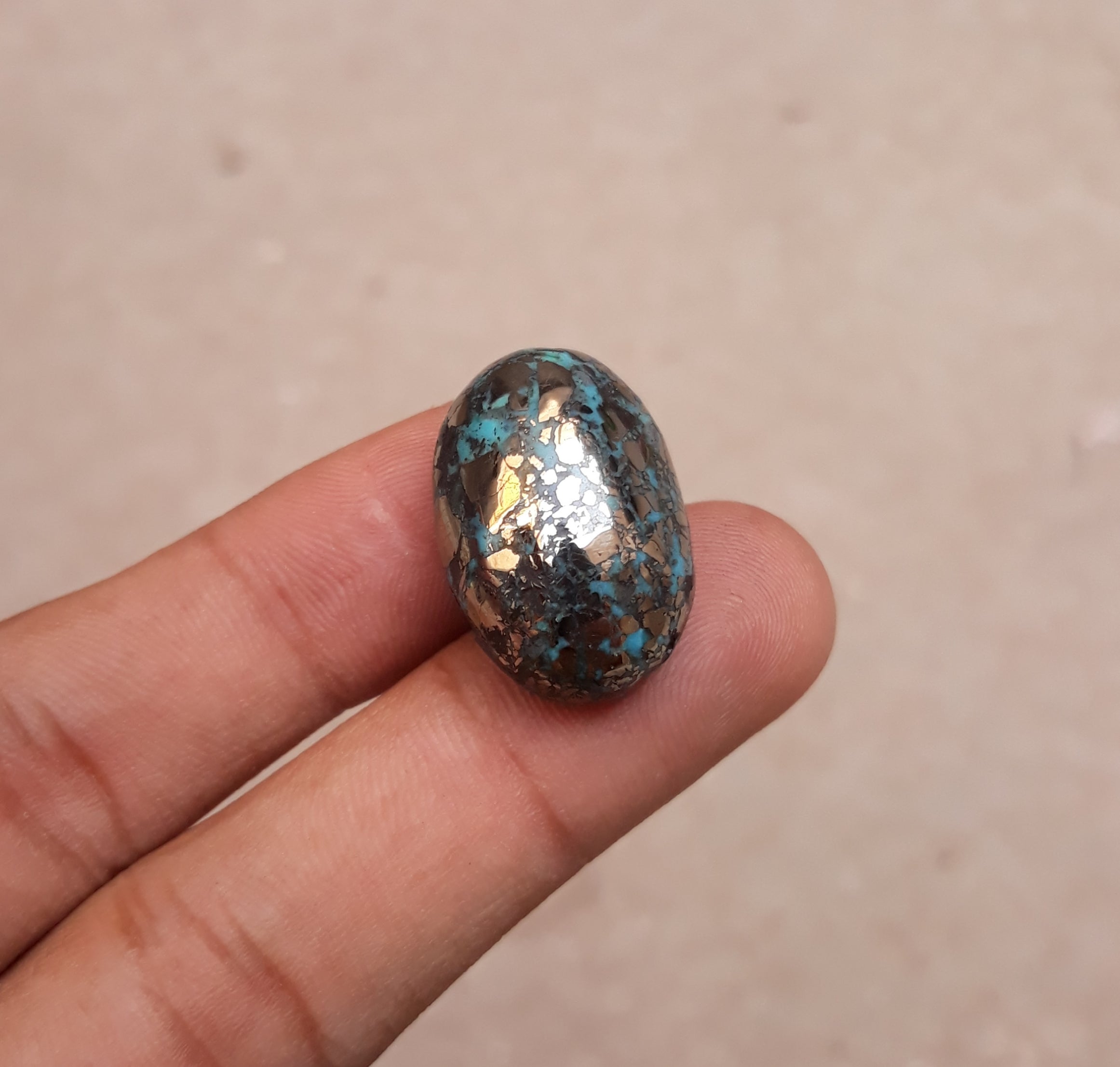 This classic Persian Turquoise cabochon features a stunning deep blue color and intricate Pyrite matrix. Professionally-cut to shape, this 48.4-carat stone is a perfect choice for creating beautiful jewelry or using as a collectible. With its eye-catching design, it is sure to add beauty to any piece.