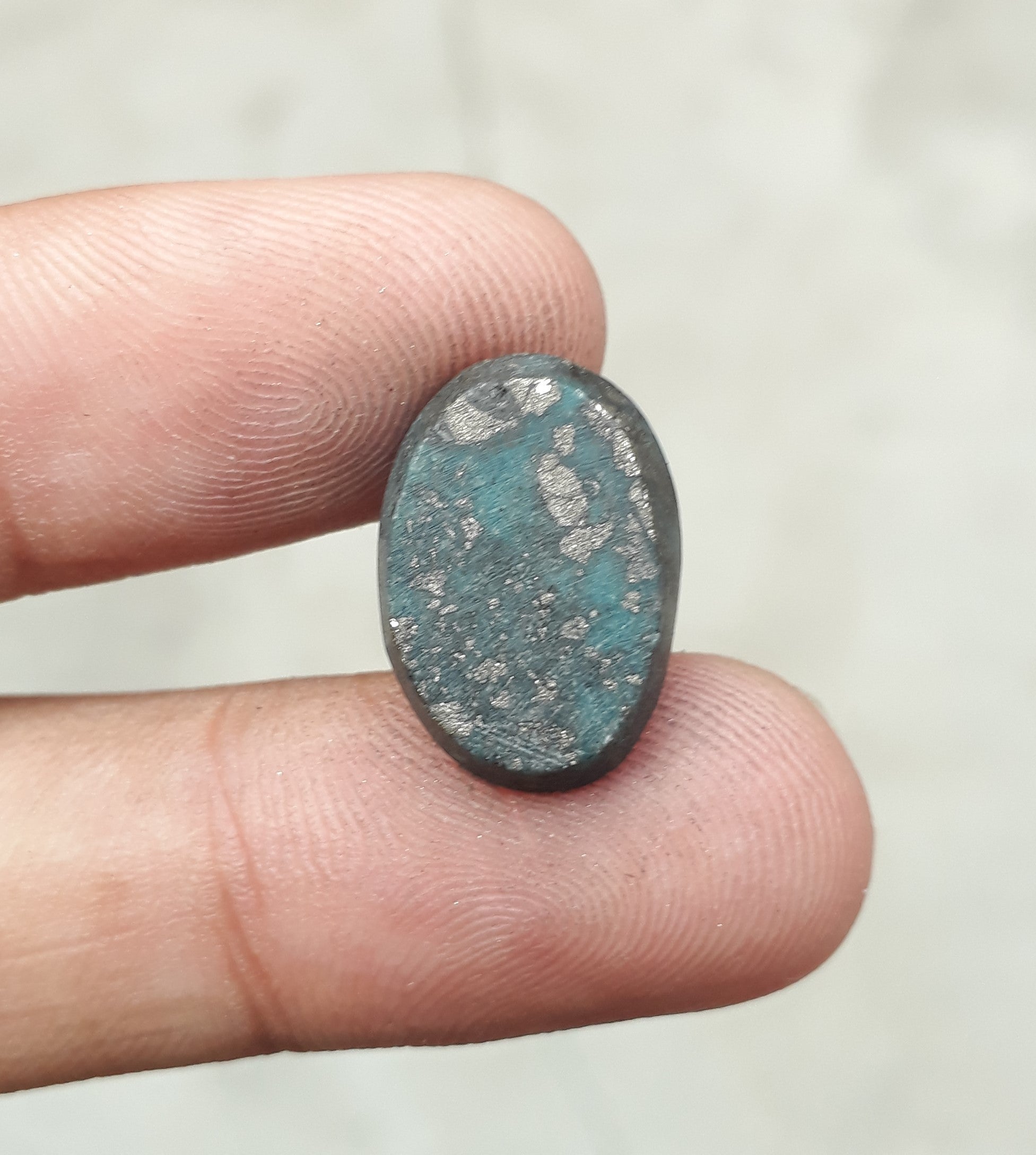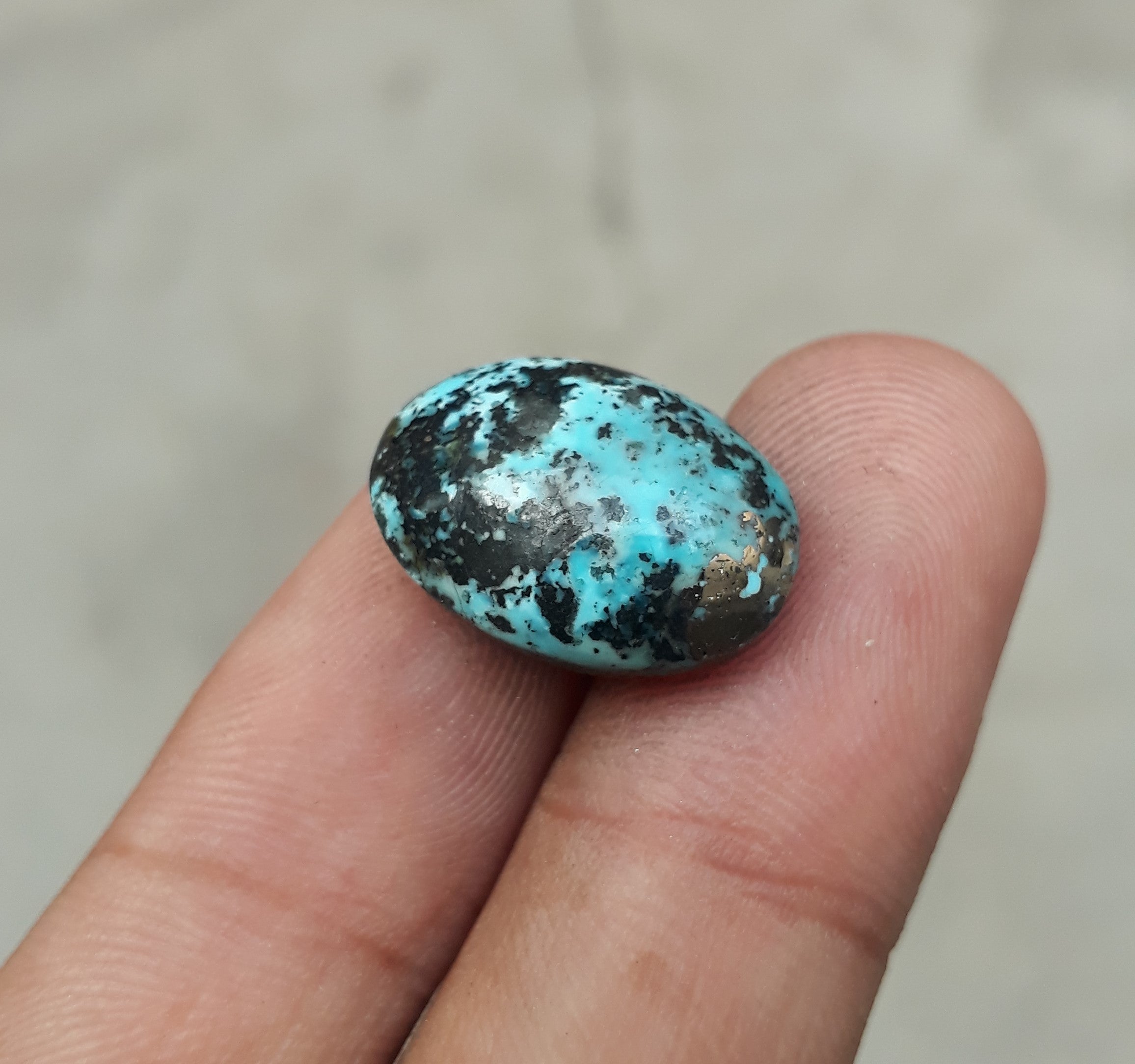 This classic Persian Turquoise cabochon features a stunning deep blue color and intricate Pyrite matrix. Professionally-cut to shape, this 15-carat stone is a perfect choice for creating beautiful jewelry or using as a collectible. With its eye-catching design, it is sure to add beauty to any piece..