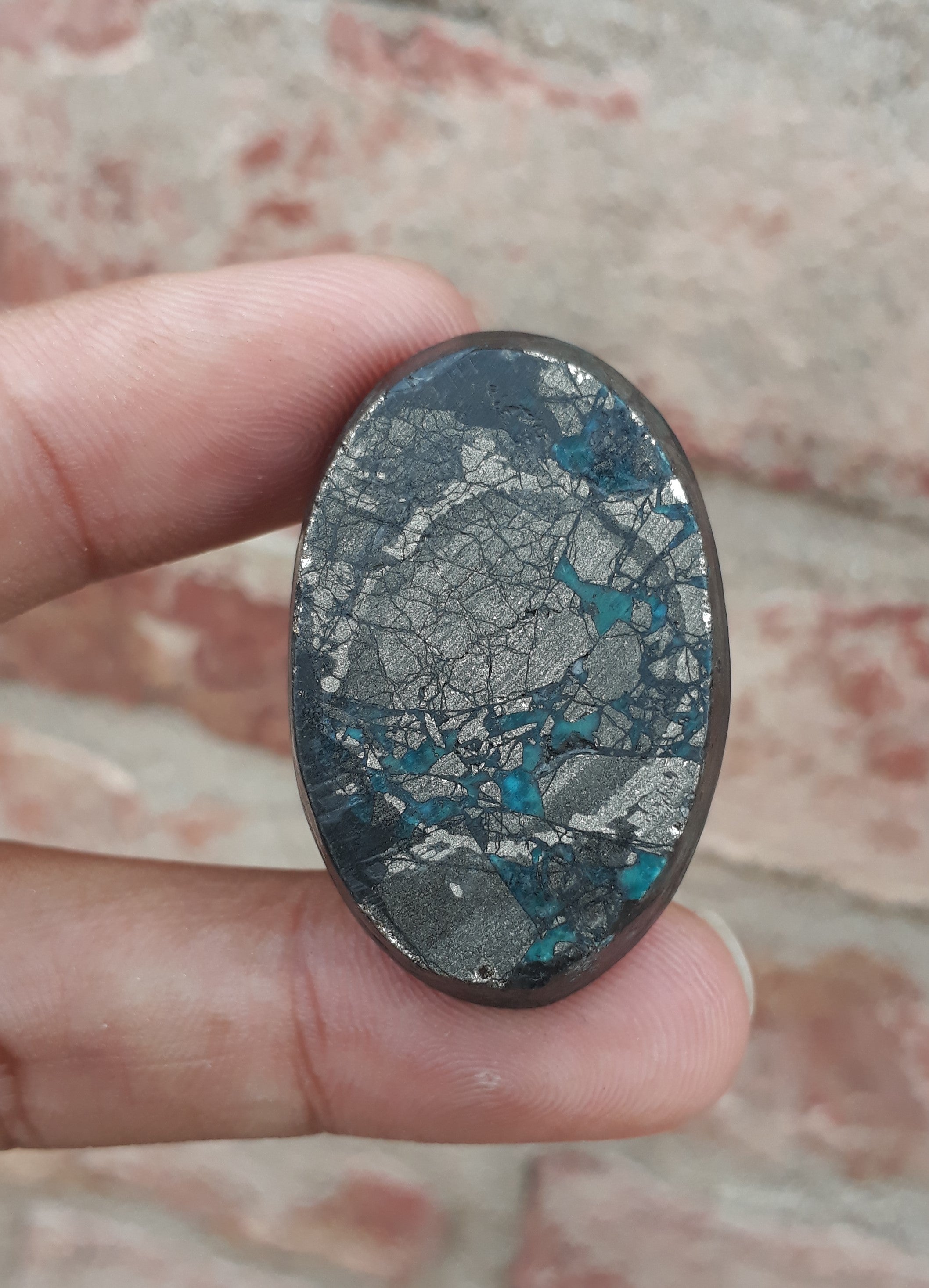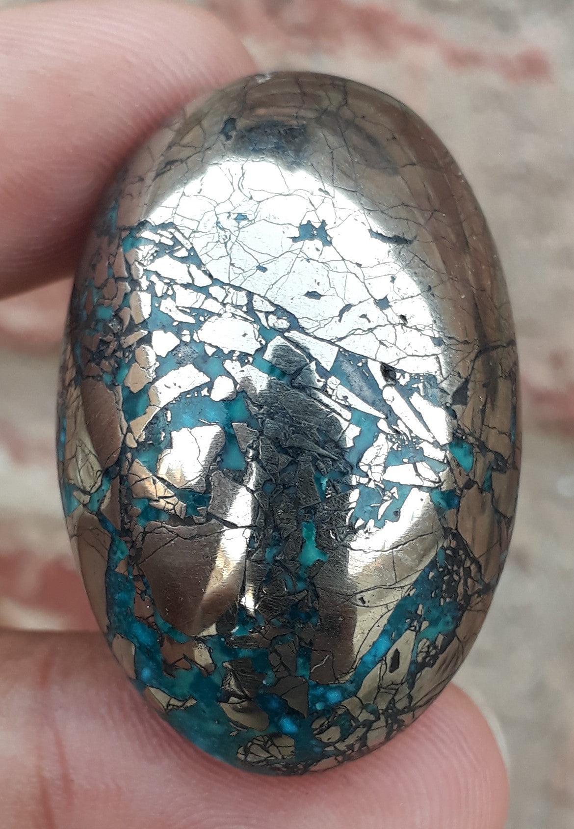 This classic Persian Turquoise cabochon features a stunning deep blue color and intricate Pyrite matrix. Professionally-cut to shape, this 184-carat stone is a perfect choice for creating beautiful jewelry or using as a collectible. With its eye-catching design, it is sure to add beauty to any piece..