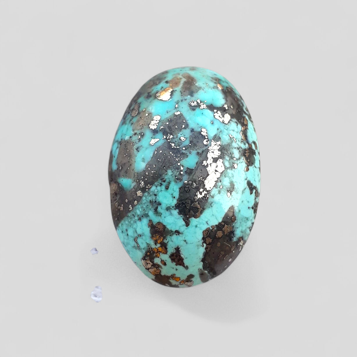 This classic Persian Turquoise cabochon features a stunning deep blue color and intricate Pyrite matrix. Professionally-cut to shape, this 22.50-carat stone is a perfect choice for creating beautiful jewelry or using as a collectible. With its eye-catching design, it is sure to add beauty to any piece..