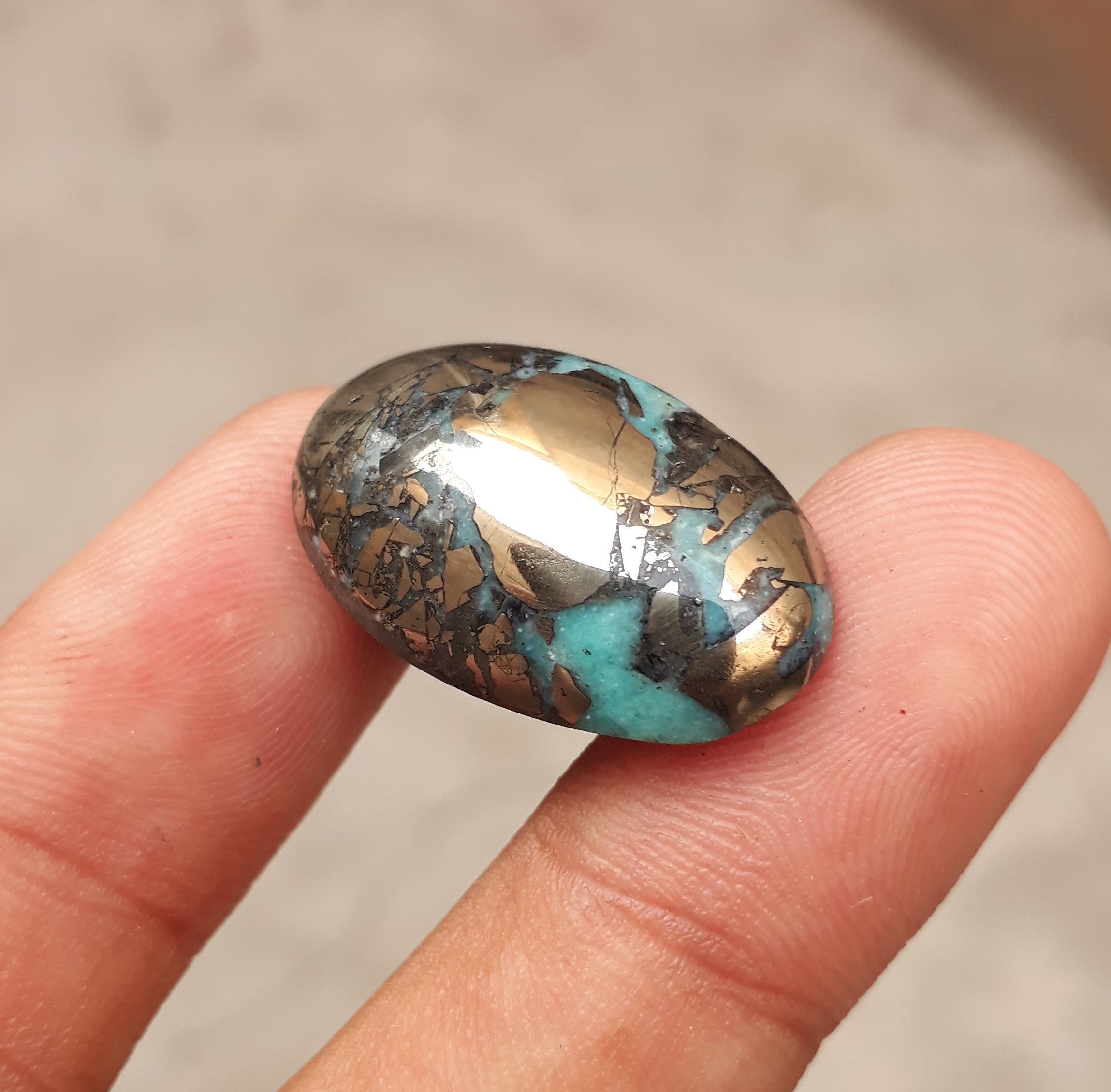This classic Persian Turquoise cabochon features a stunning deep blue color and intricate Pyrite matrix. Professionally-cut to shape, this 28.40-carat stone is a perfect choice for creating beautiful jewelry or using as a collectible. With its eye-catching design, it is sure to add beauty to any piece..