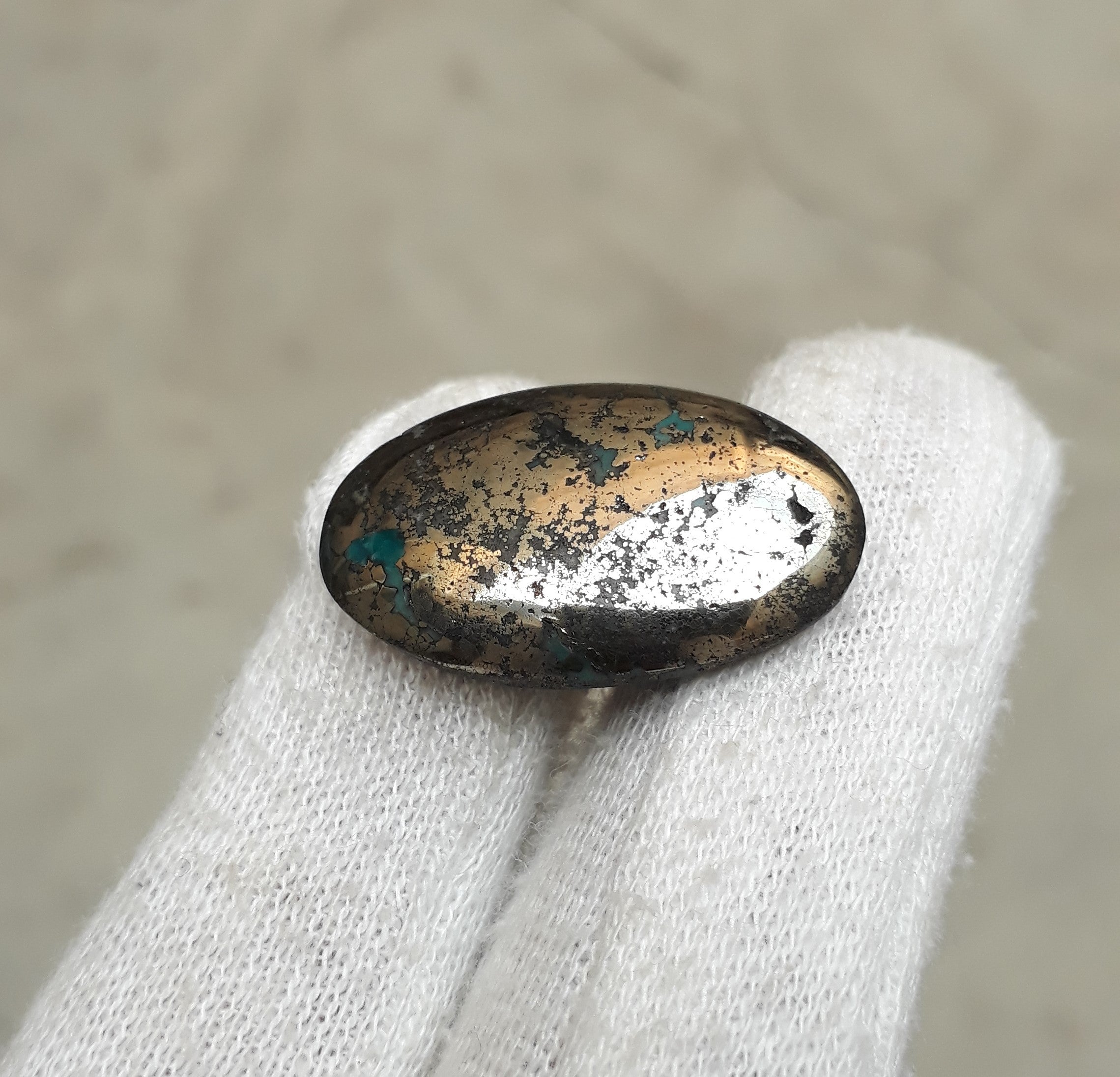 This classic Persian Turquoise cabochon features a stunning deep blue color and intricate Pyrite matrix. Professionally-cut to shape, this 38-carat stone is a perfect choice for creating beautiful jewelry or using as a collectible. With its eye-catching design, it is sure to add beauty to any piece..