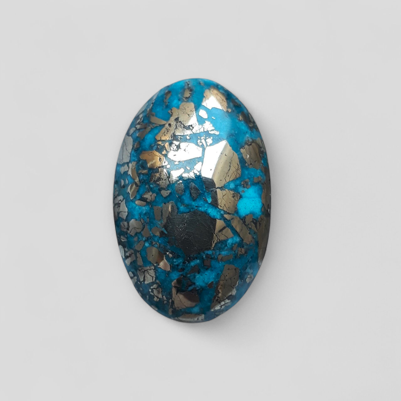 This classic Persian Turquoise cabochon features a stunning deep blue color and intricate Pyrite matrix. Professionally-cut to shape, this 43-carat stone is a perfect choice for creating beautiful jewelry or using as a collectible. With its eye-catching design, it is sure to add beauty to any piece..