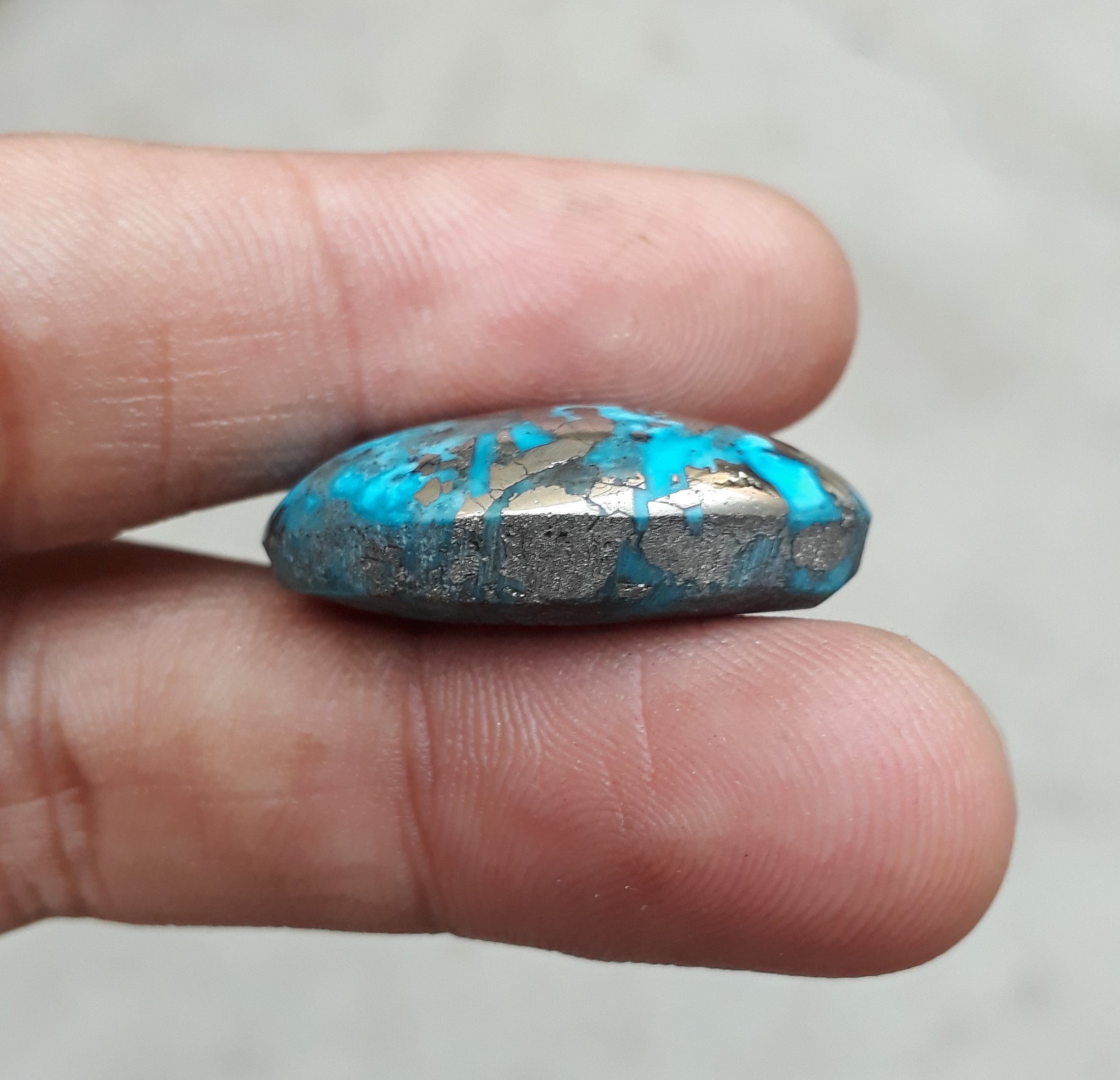 This classic Persian Turquoise cabochon features a stunning deep blue color and intricate Pyrite matrix. Professionally-cut to shape, this 49.3-carat stone is a perfect choice for creating beautiful jewelry or using as a collectible. With its eye-catching design, it is sure to add beauty to any piece..