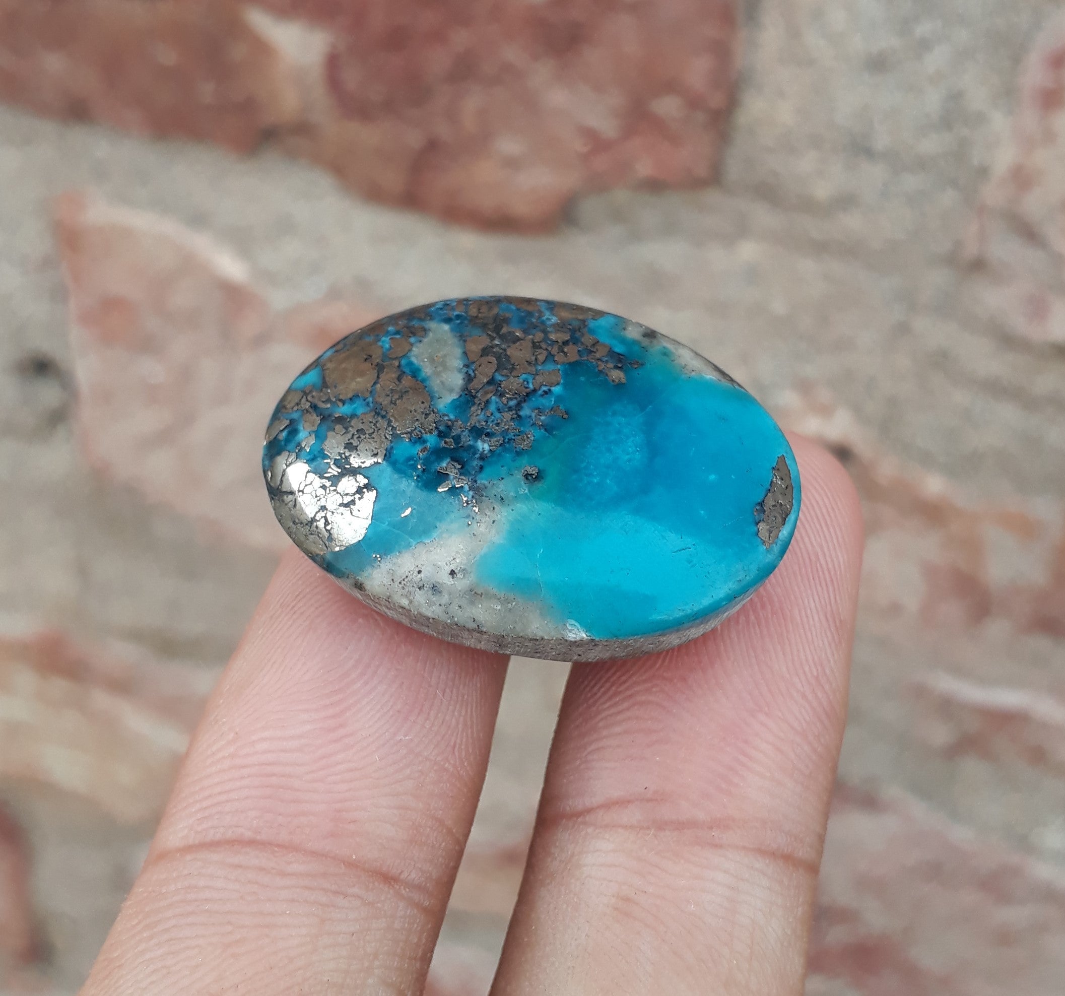 This classic Persian Turquoise cabochon features a stunning deep blue color and intricate Pyrite matrix. Professionally-cut to shape, this 50-carat stone is a perfect choice for creating beautiful jewelry or using as a collectible. With its eye-catching design, it is sure to add beauty to any piece..