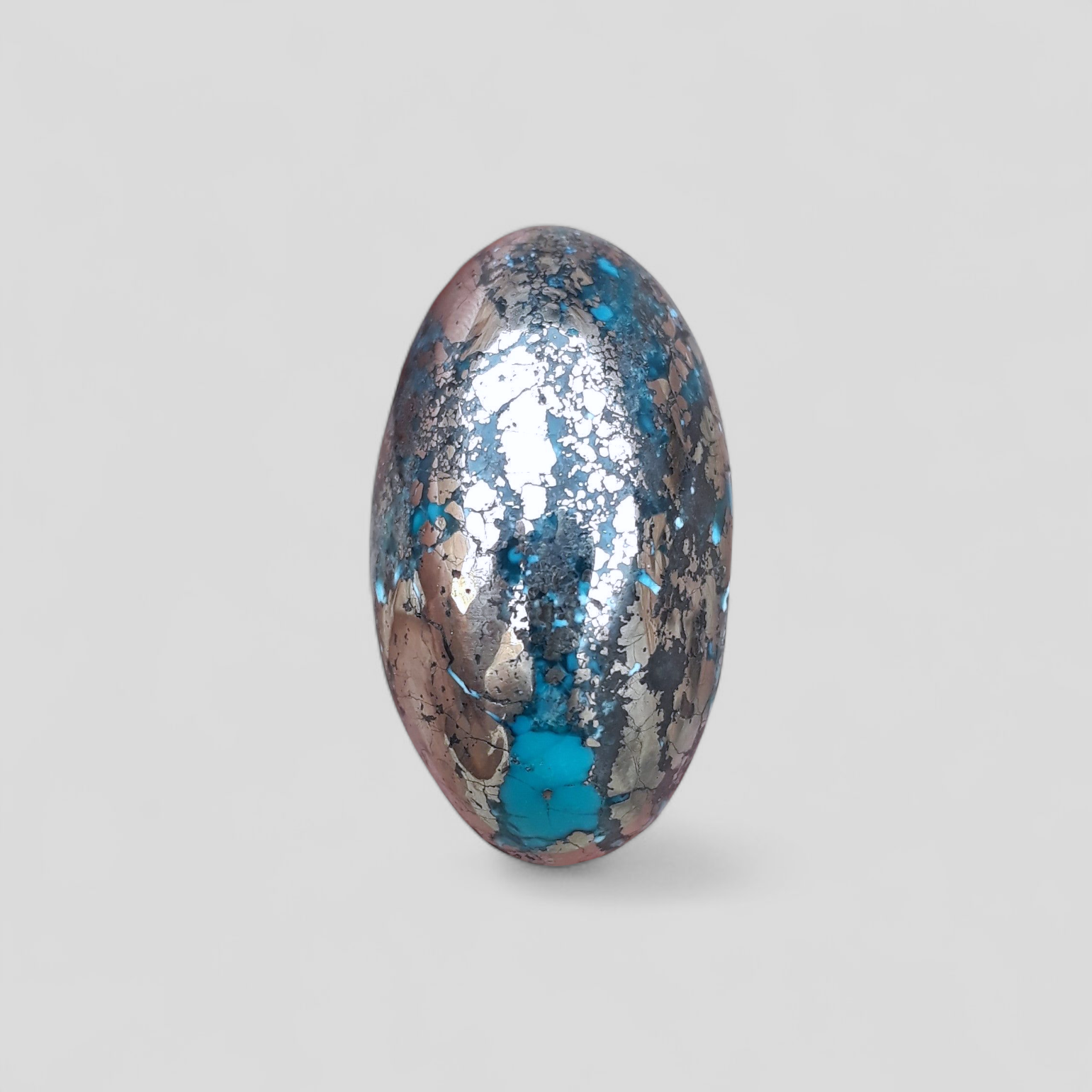 This classic Persian Turquoise cabochon features a stunning deep blue color and intricate Pyrite matrix. Professionally-cut to shape, this 75-carat stone is a perfect choice for creating beautiful jewelry or using as a collectible. With its eye-catching design, it is sure to add beauty to any piece..