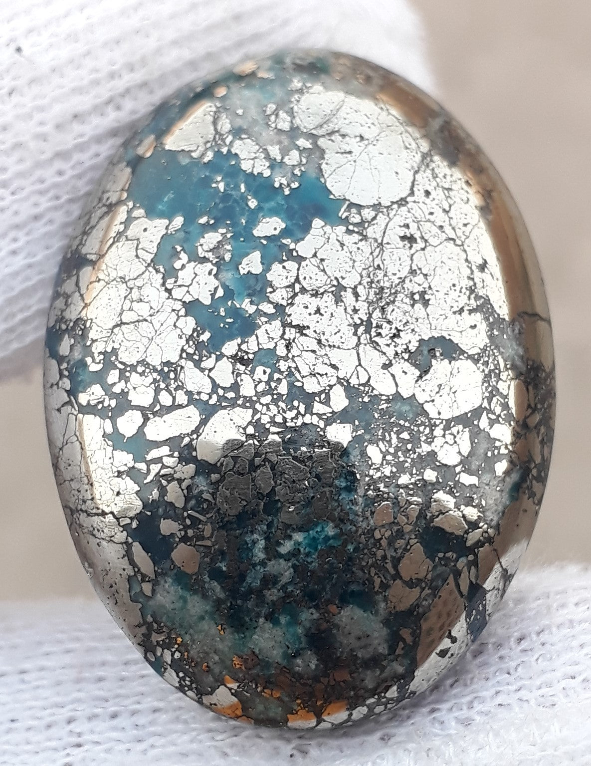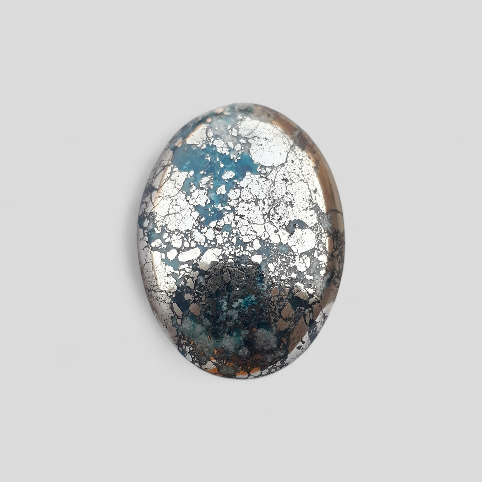 This classic Persian Turquoise cabochon features a stunning deep blue color and intricate Pyrite matrix. Professionally-cut to shape, this 81-carat stone is a perfect choice for creating beautiful jewelry or using as a collectible. With its eye-catching design, it is sure to add beauty to any piece..