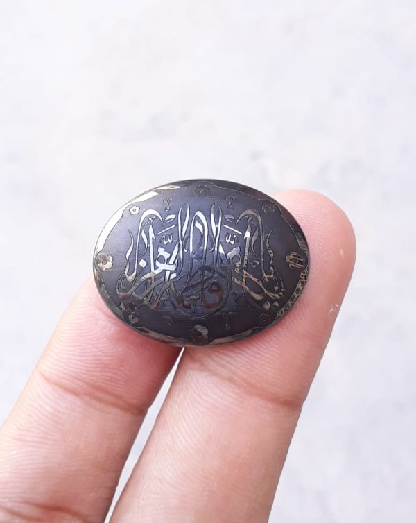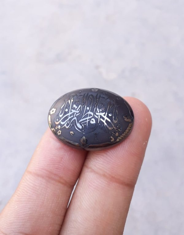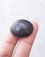This beautiful Hematite Cabochon Gem is 30x22mm and comprised of natural Hematite, widely known as Hadeed Cheeni in Islamic culture. Engraved with traditional Islamic verses, this gem possesses restorative properties and a captivating beauty. Add it to your collection to benefit from the spiritual and healing power of hematite.