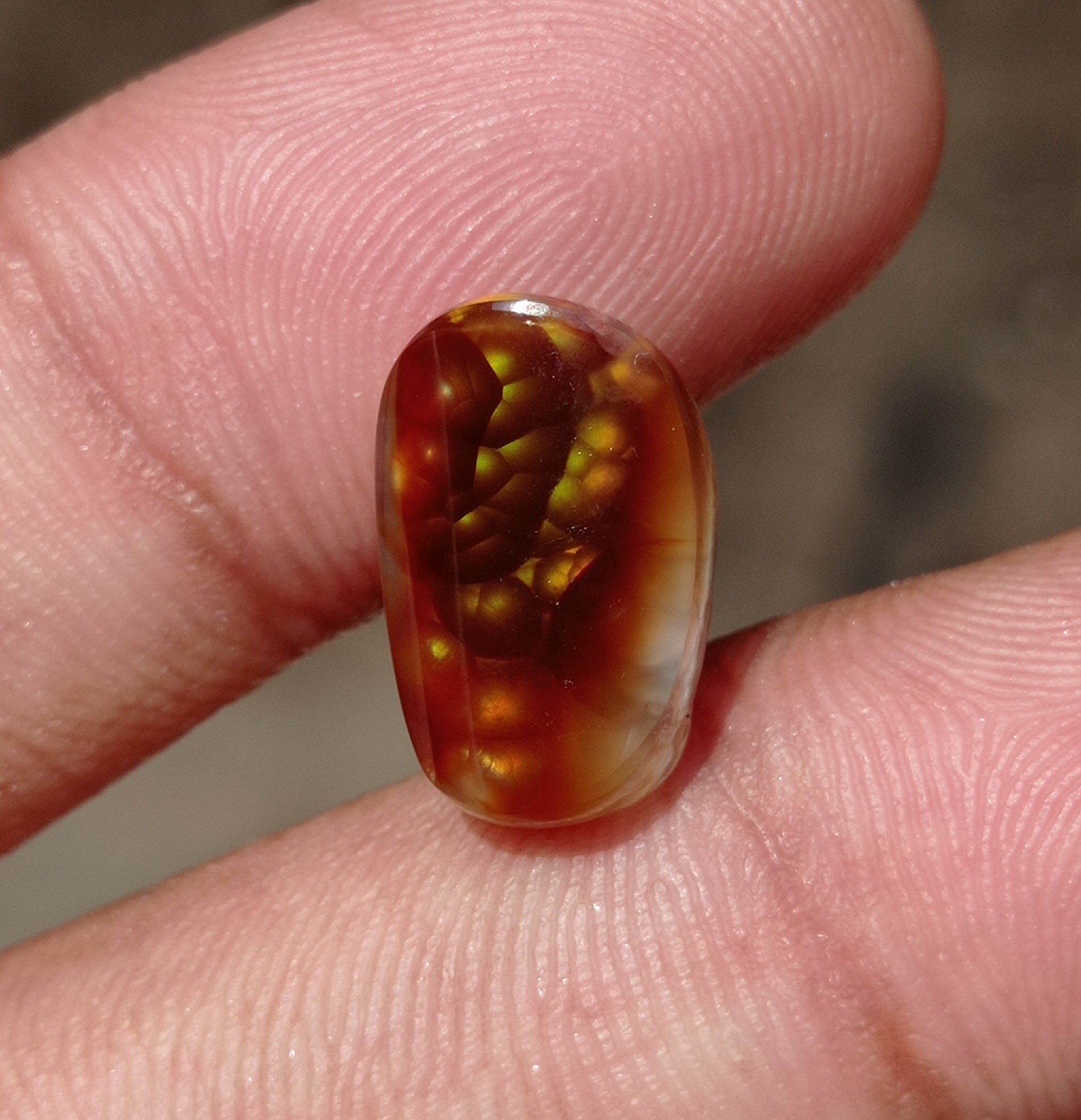 This unique Mexican Fire Agate is extremely rare and makes for an exquisite gemstone. With its 16x10x6mm dimensions and bubbly cabochon, it is more valuable than many diamonds and sure to add an eye-catching touch to any collection.