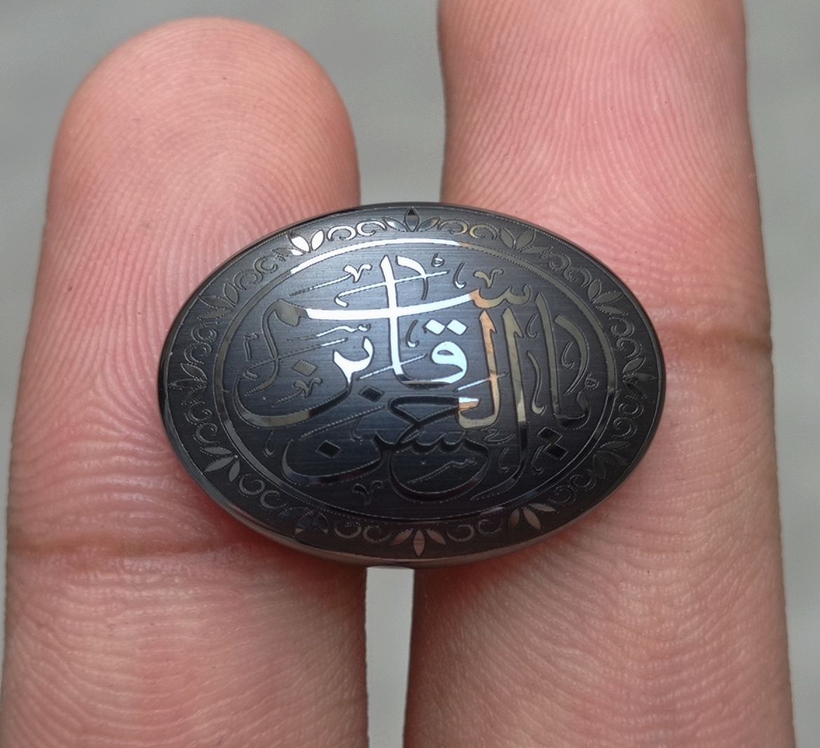 This beautiful Hematite Cabochon Gem is 25x17mm and comprised of natural Hematite, widely known as Hadeed Cheeni in Islamic culture. Engraved with traditional Islamic verses, this gem possesses restorative properties and a captivating beauty. Add it to your collection to benefit from the spiritual and healing power of hematite.