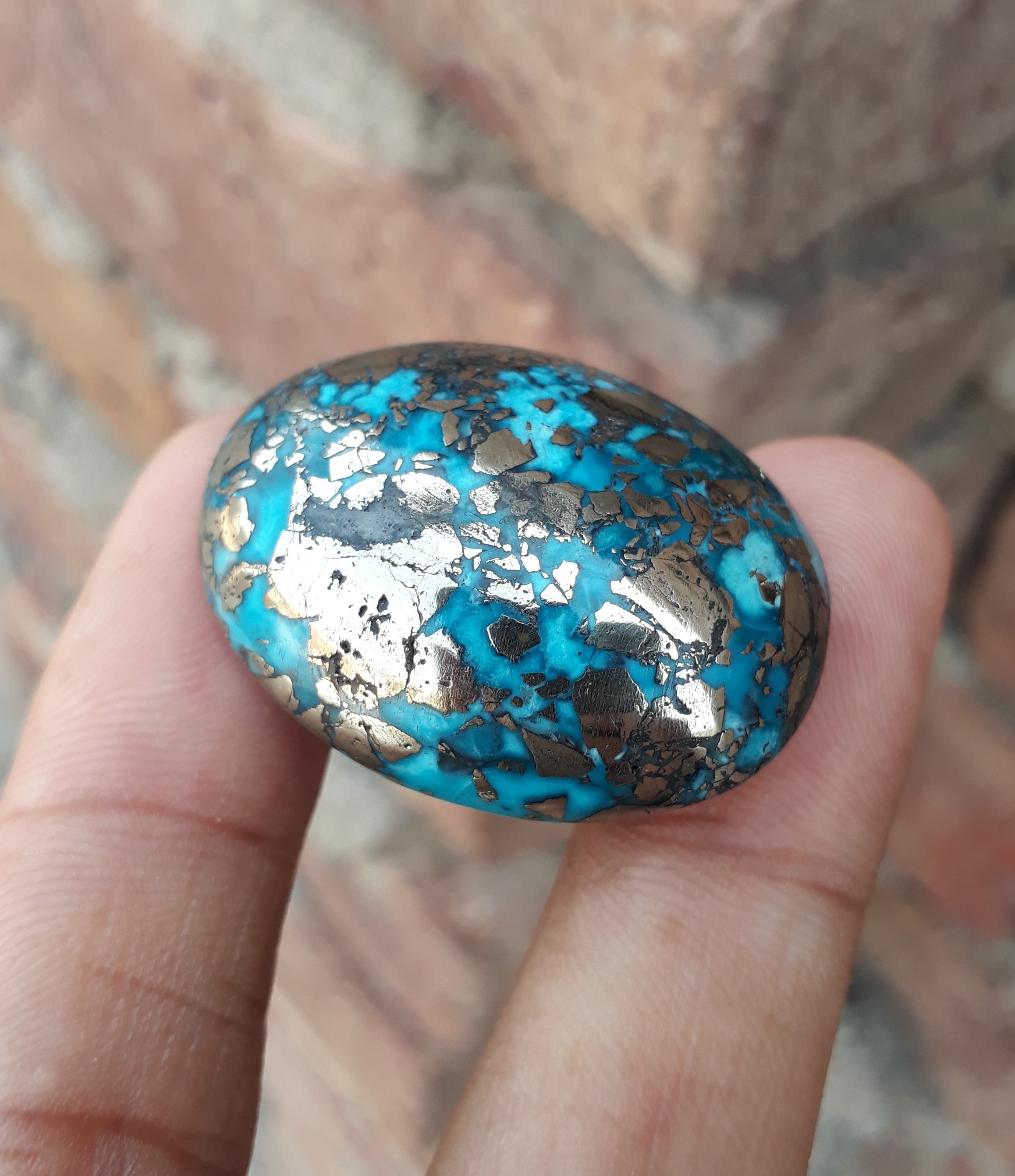 This classic Persian Turquoise cabochon features a stunning deep blue color and intricate Pyrite matrix. Professionally-cut to shape, this 117-carat stone is a perfect choice for creating beautiful jewelry or using as a collectible. With its eye-catching design, it is sure to add beauty to any piece..