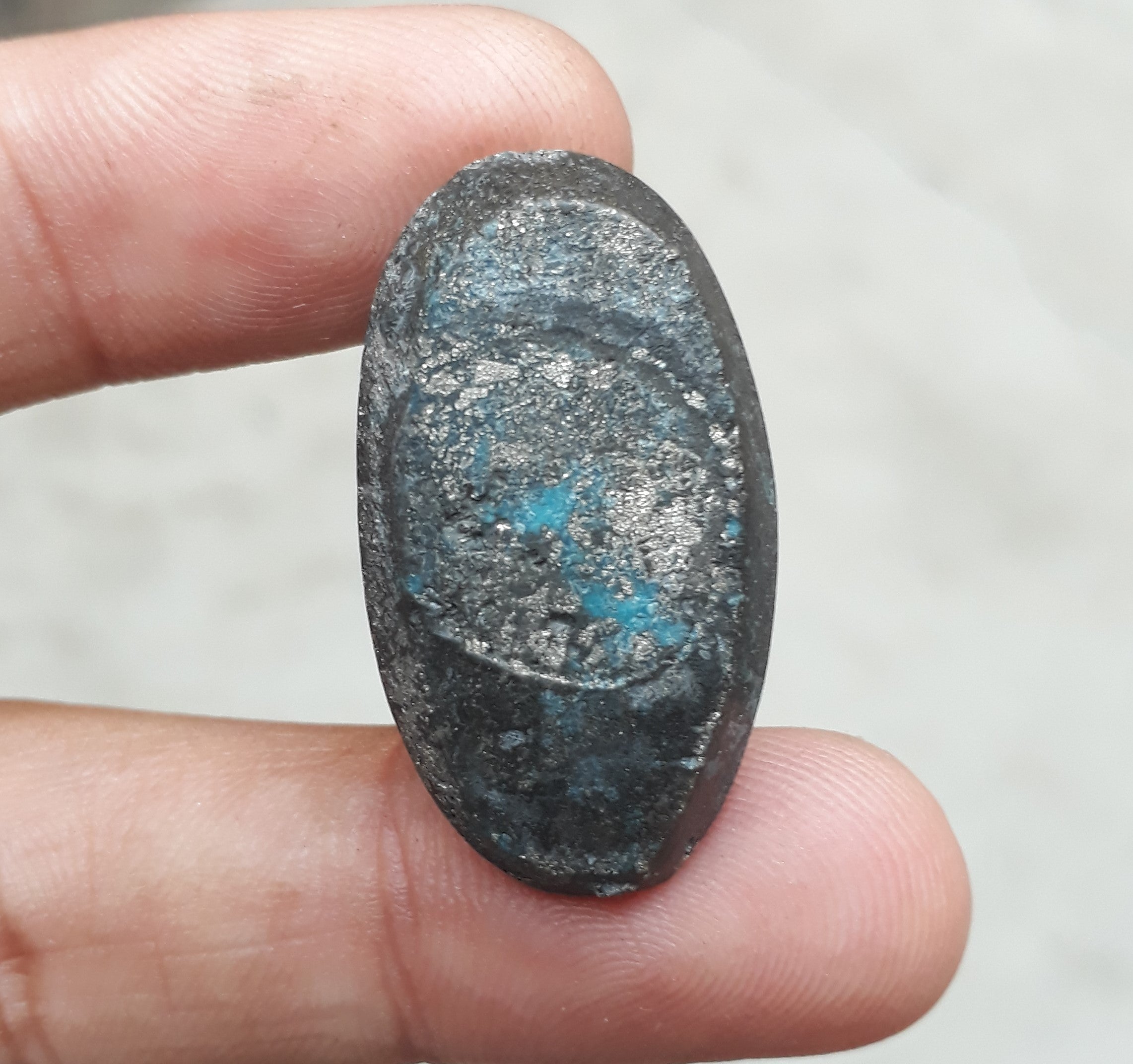 This classic Persian Turquoise cabochon features a stunning deep blue color and intricate Pyrite matrix. Professionally-cut to shape, this 71.5-carat stone is a perfect choice for creating beautiful jewelry or using as a collectible. With its eye-catching design, it is sure to add beauty to any piece..